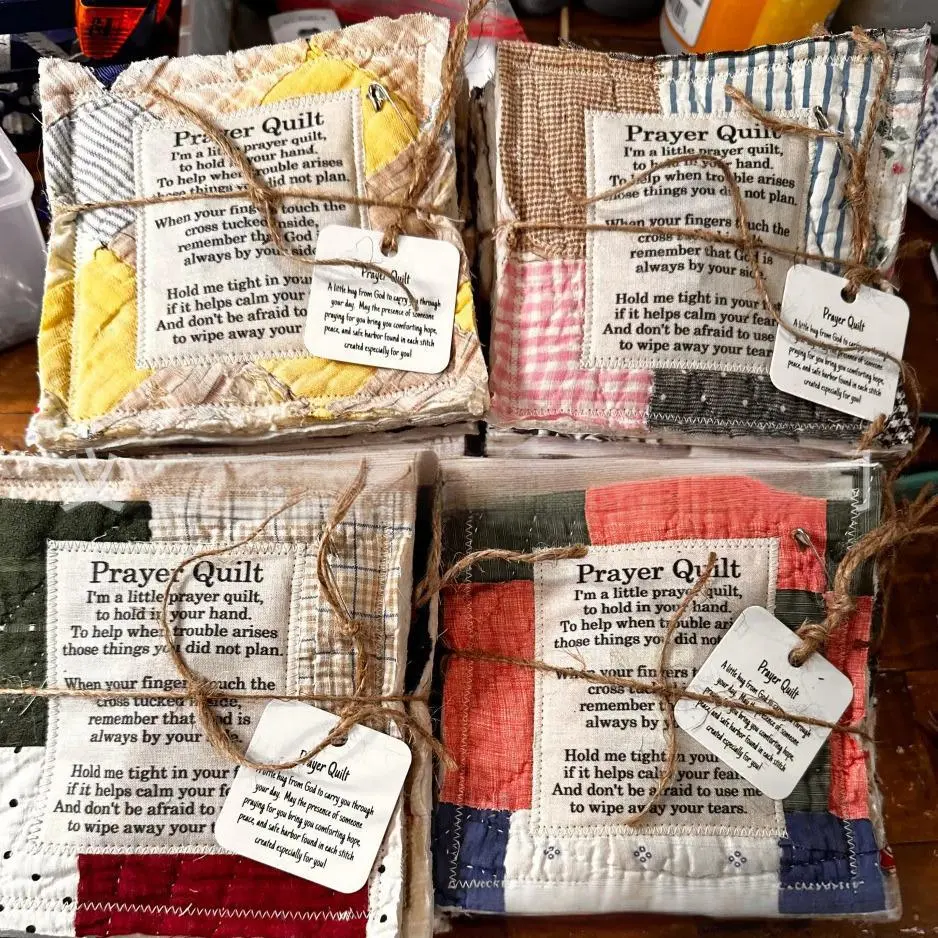 Pocket Prayer Quilt: It is a small quilt you carry in your pocket with a sweet prayer on it.These can be put in your pocket, your purse, or even tucked into your child's backpack.