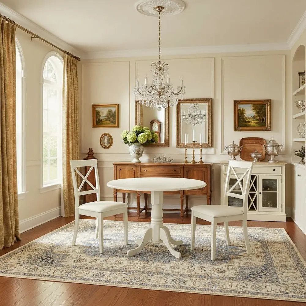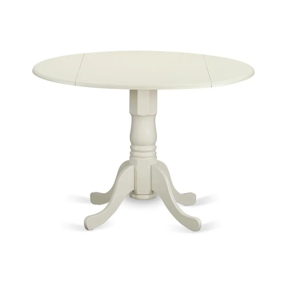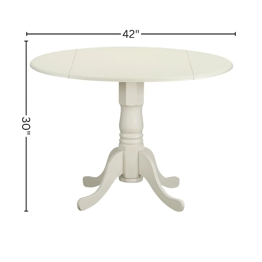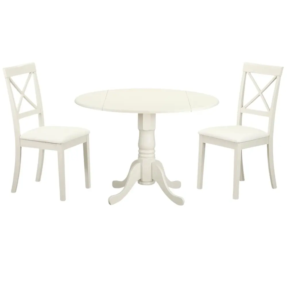 This beautiful 3-piece kitchen dinette set consists of an attractive wood table and 2 excellent mid-century dining chairs, offering a cozy and stylish solution for smaller spaces. The furniture is finished in a fantastic Linen White color, a refreshing tone that ensures the kitchen dinette set matches easily to any décor and provides the kitchen a wonderful appearance. We have painted this set using expensive and irremovable colors to guarantee a long-lasting, quality finish. The small dinette set is made of superior quality Asian wood, also known as Rubber Wood. This dense wood delivers awesome stability and ensures you can use this dining room table set for a very long time. We have chosen only good quality wood so that the set remains a beautiful and functional addition to your home. Our wonderful wooden chairs are designed for comfort, featuring a sturdy Rubber Wood frame, a cushioned Faux Leather seat, and an X-back. This construction gives complete support and a good sitting experience, enhancing the joy of family meals. The wood table consists of a round top, pedestal legs, and 2 convenient drop leaves. This feature makes the table very useful to you because you can easily drop the leaves down to save space or raise them to accommodate guests, offering superb flexibility. The dimensions of the stunning modern dining table are: Length 42; Width 42; Height 29.5. The measurements of the amazing kitchen chair are: Width 21; Depth 18; Height 38. Photo may be slightly different from the actual item in terms of color due to the monitor's display. The product will be delivered in its original manufacturer packaging.