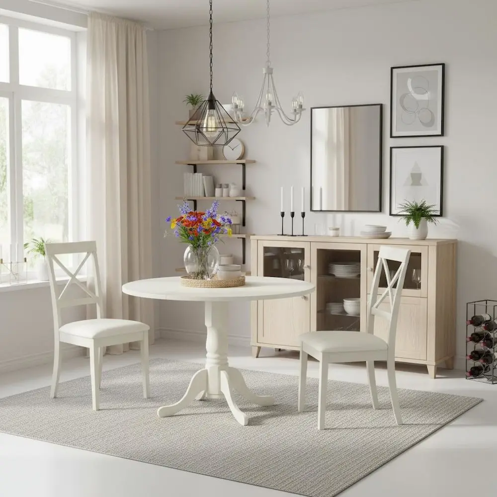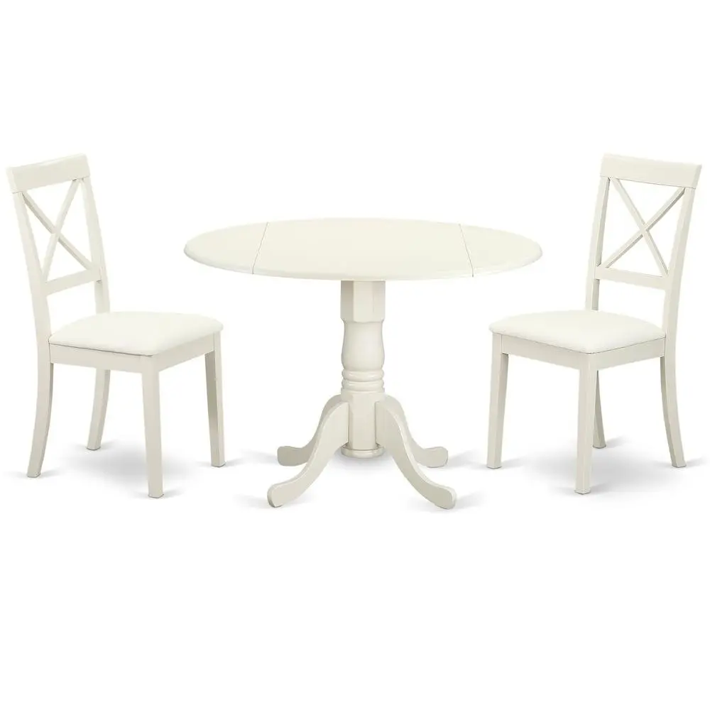 White Dining Set, Round Drop Leaf Table, X-Back Chairs, 2-Person, Faux Leather