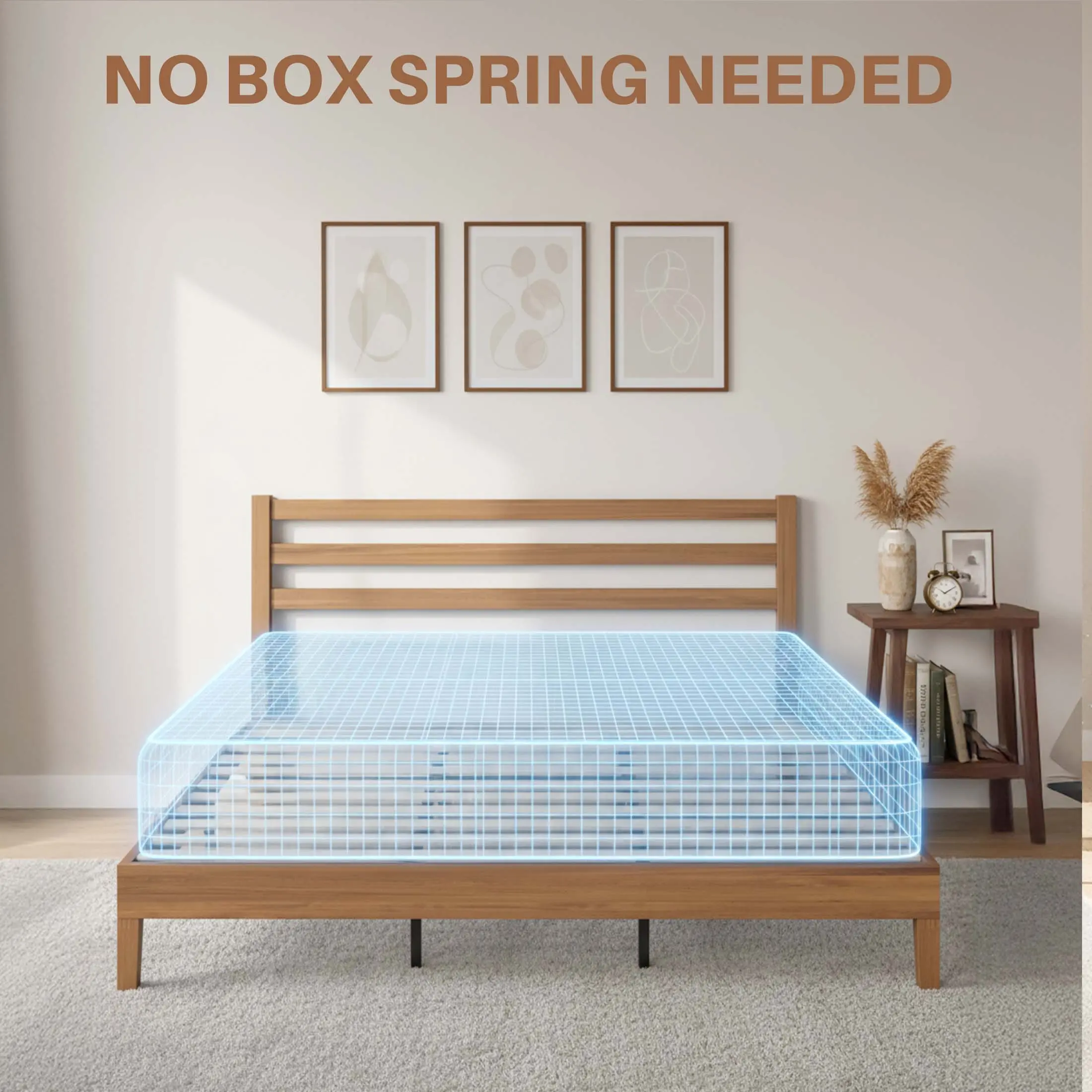 No Box Spring Required: Say goodbye to the hassle of finding the perfect box spring for your bed frame. The Wood Bed Frame is designed to be used without a box spring, saving you time and money while ensuring a comfortable sleep experience.
