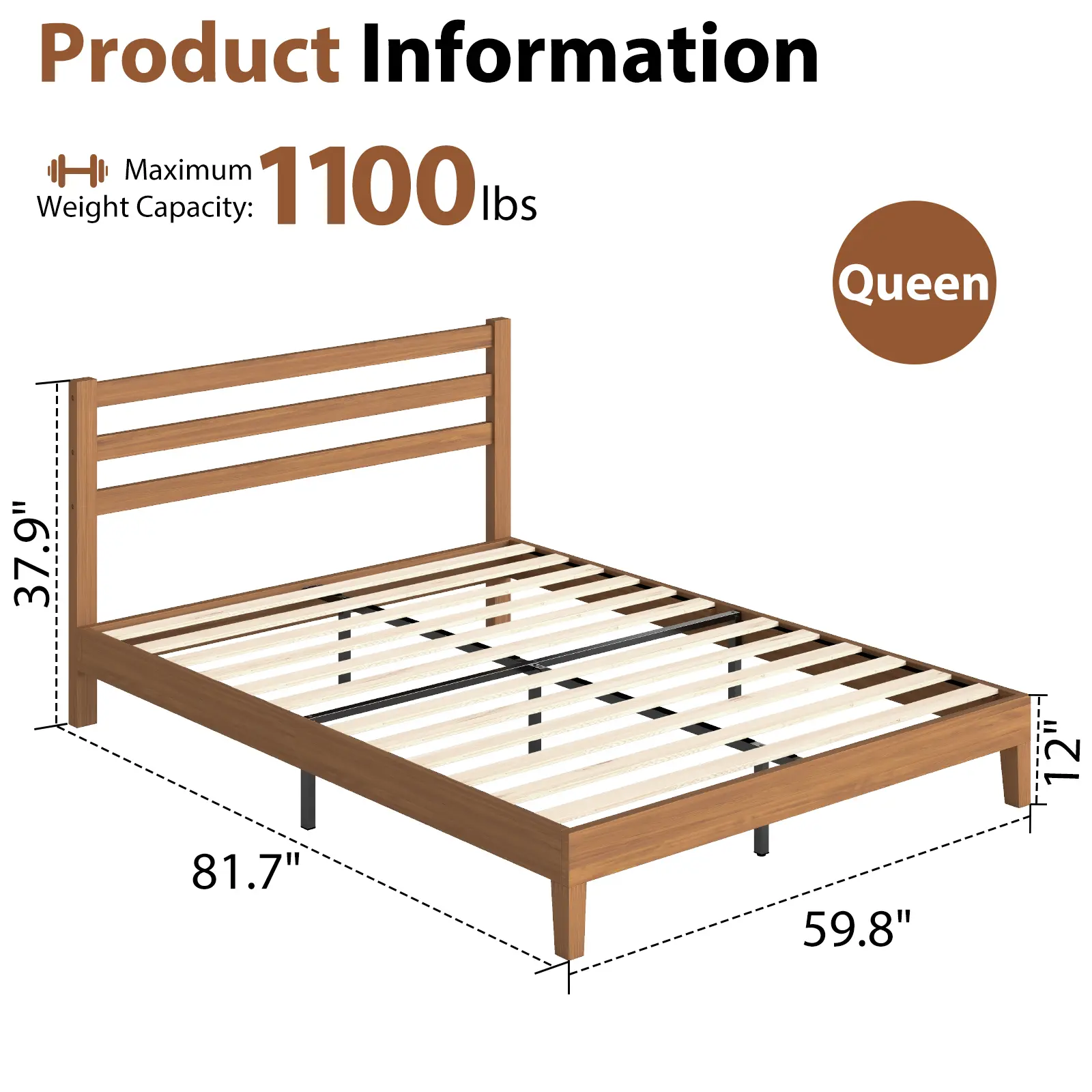 Wood Bed Frame with Headboard - Walnut Finish, Solid Wood Slat Support System, No Box Spring Required