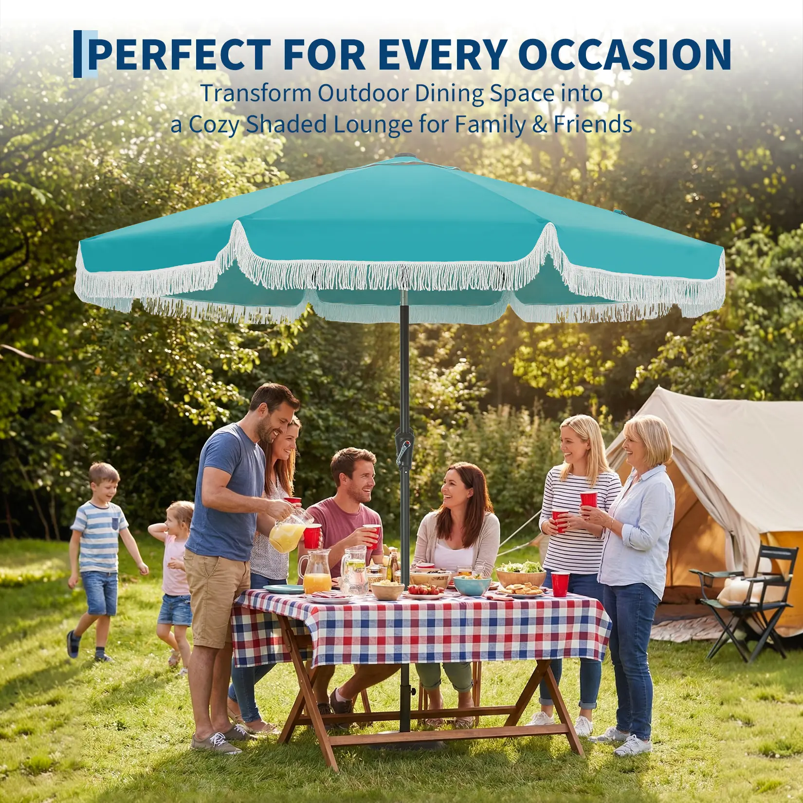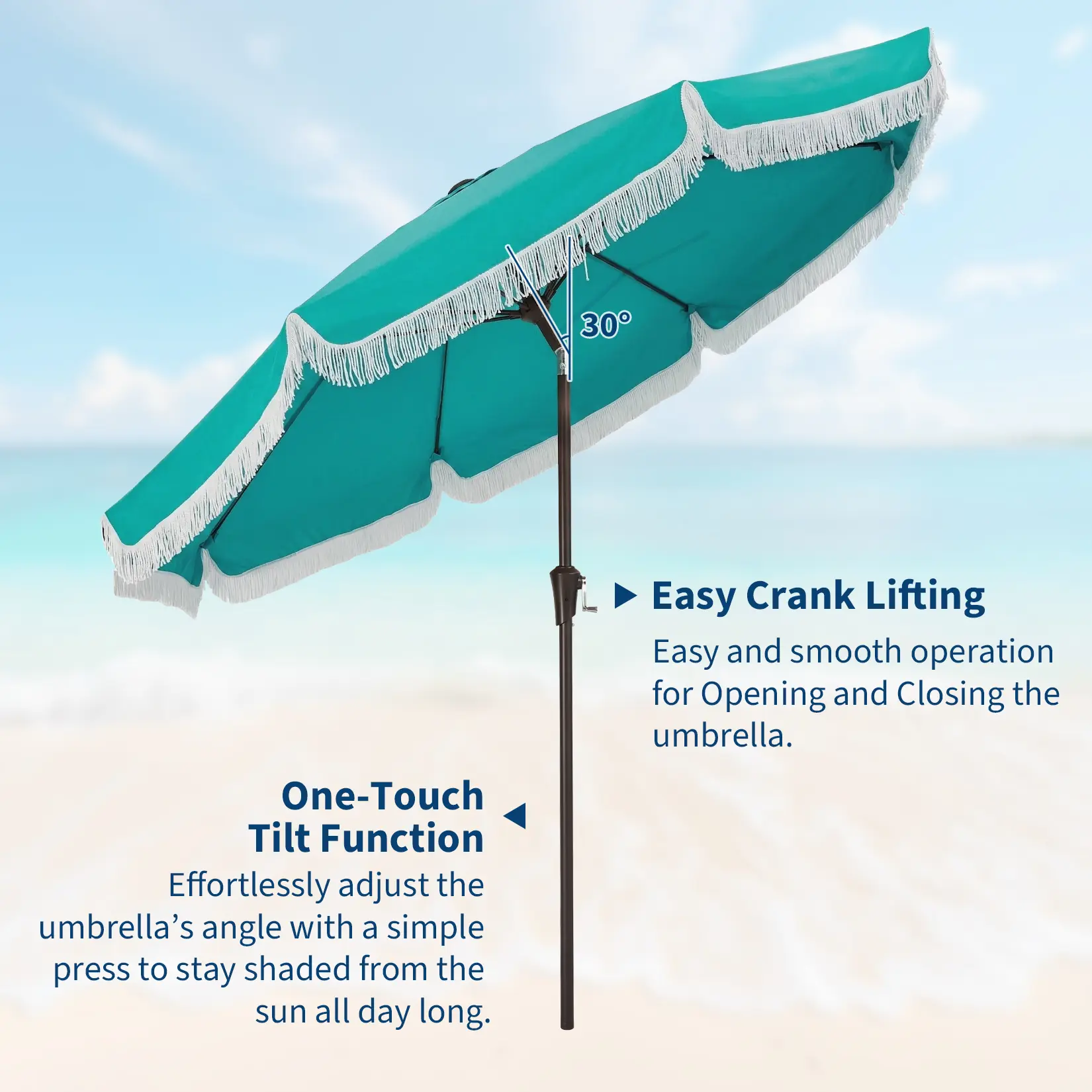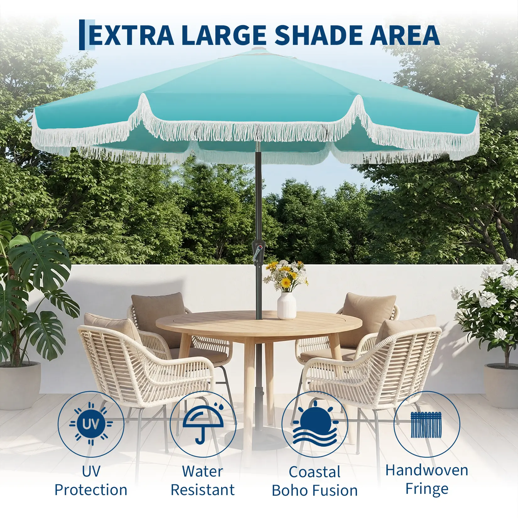 Imagine a sunny afternoon spent in your backyard oasis, the gentle breeze rustling through the leaves as you lounge in style beneath your 9 ft patio umbrella with fringe. With its boho print, hand-woven tassels, and breezy scalloped edges, this tassel outdoor beach umbrella not only creates a playful, summery vibe, but also delivers reliable UV 50+ sun protection and all-day comfort whether you’re at the beach, garden, deck, or poolside.