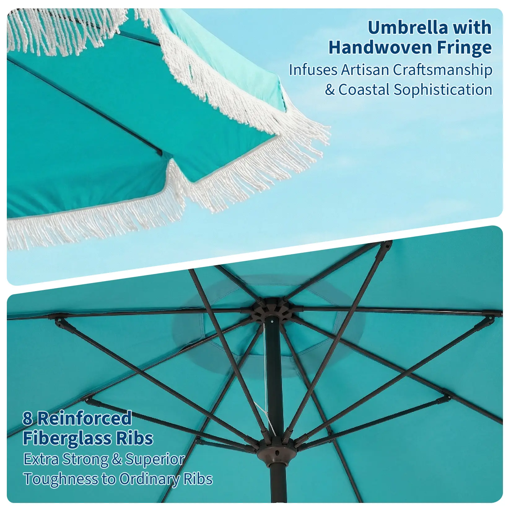 Heavy-duty construction with 8 reinforced fiberglass ribs and powder-coated metal pole