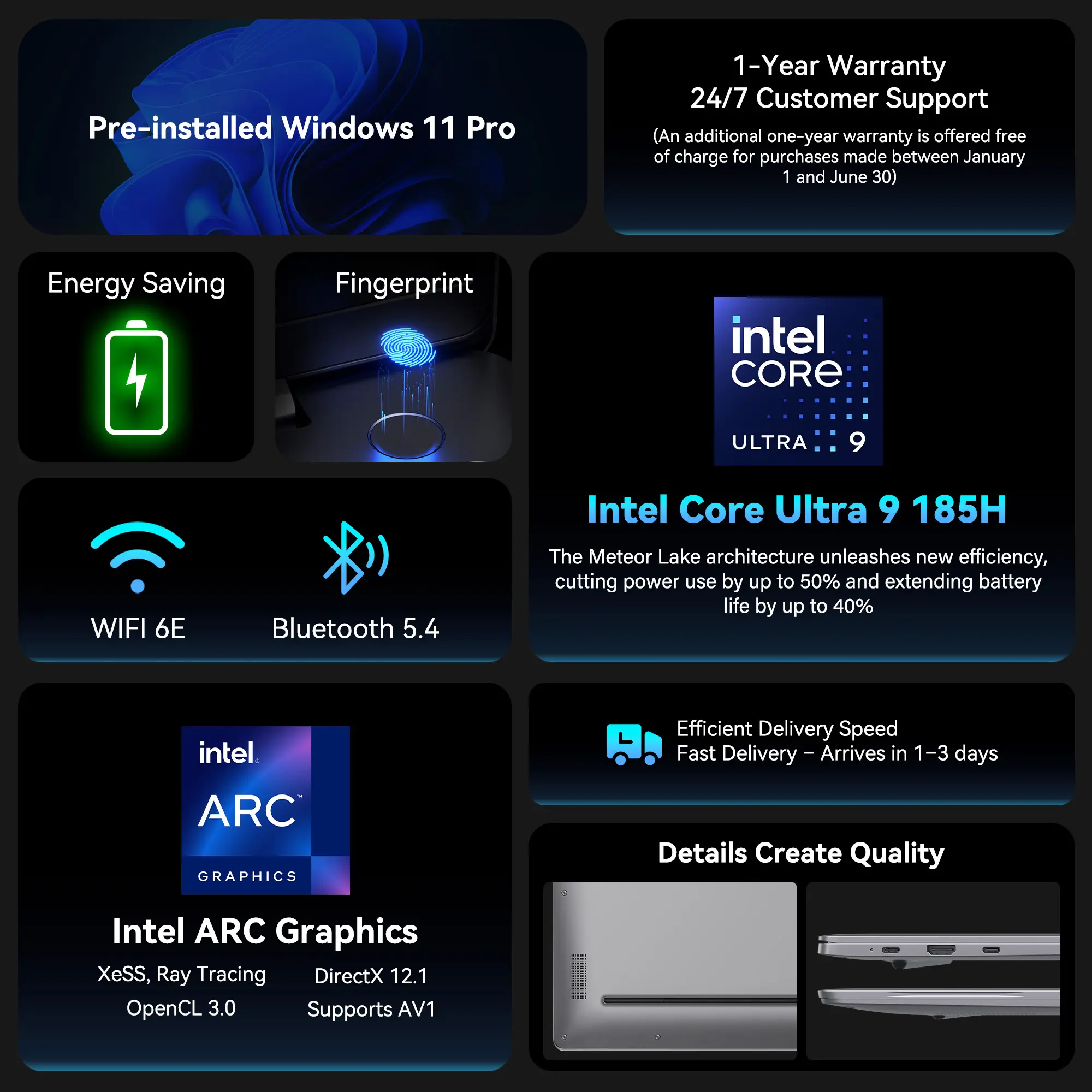 ·Elite Intel Core Ultra Power – Featuring Intel Core Ultra 9-185H / Ultra 5-125H with Intel Arc Graphics and NPU for advanced AI-ready workflows.