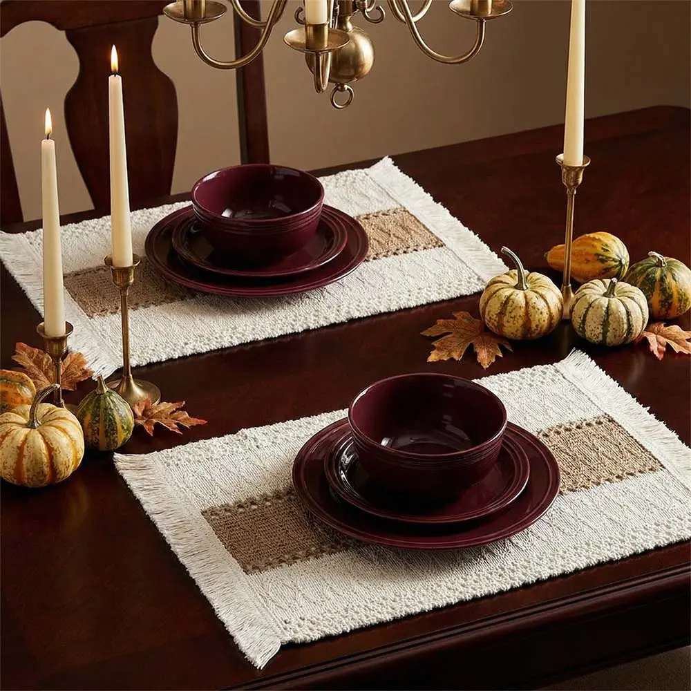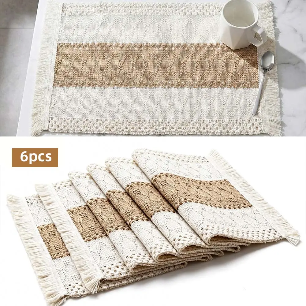 NATURAL MATERIALS: Our placemats are made of 100% natural materials, including soft skin-friendly cotton with tassels and hollow stripes woven from burlap.The color is beige on both sides and brown in the middle