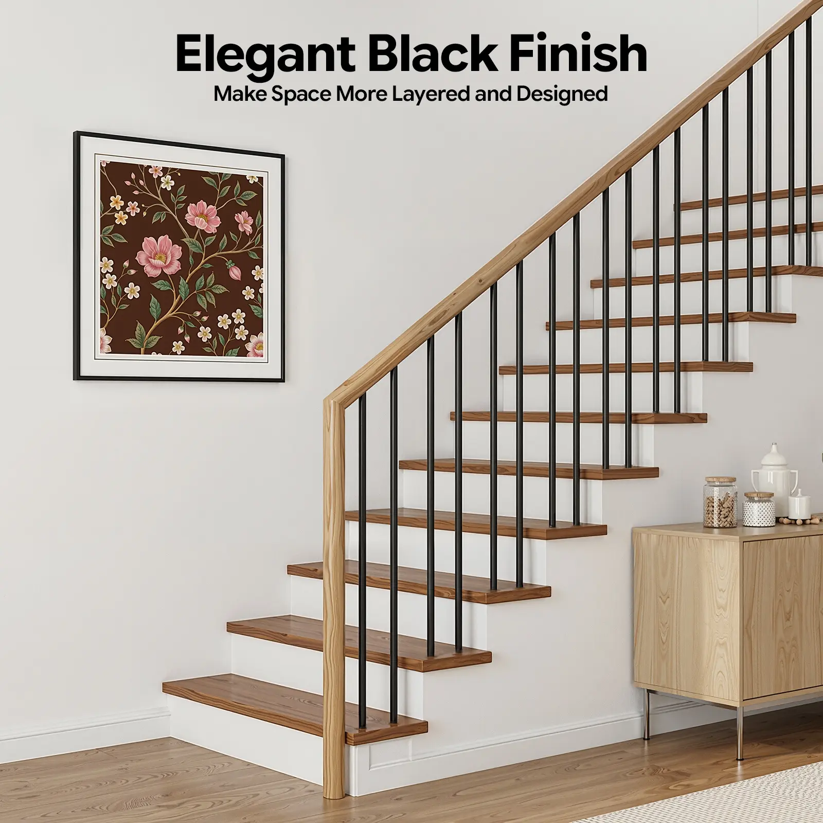 This set of staircase balusters will add a layer of sophistication to your stairs and balconies and provide solid protection for your family. High-strength iron and high-temperature baking paint make it not easy to deform, break, or wear. In addition, its elegant shape and color make it a unique and excellent decoration for your living space.