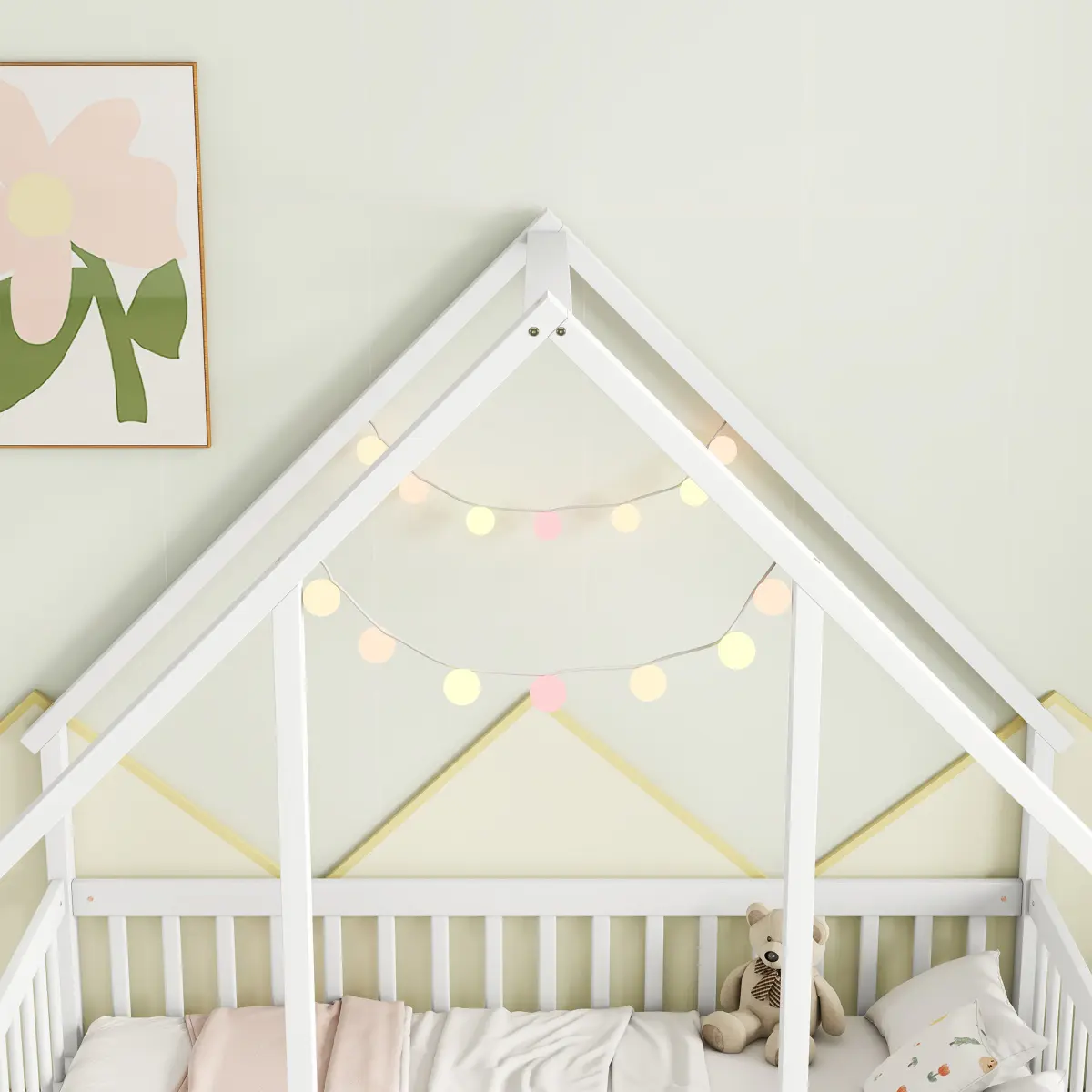 Twin Wood House-Shaped Floor Bed with Fence, Guardrails