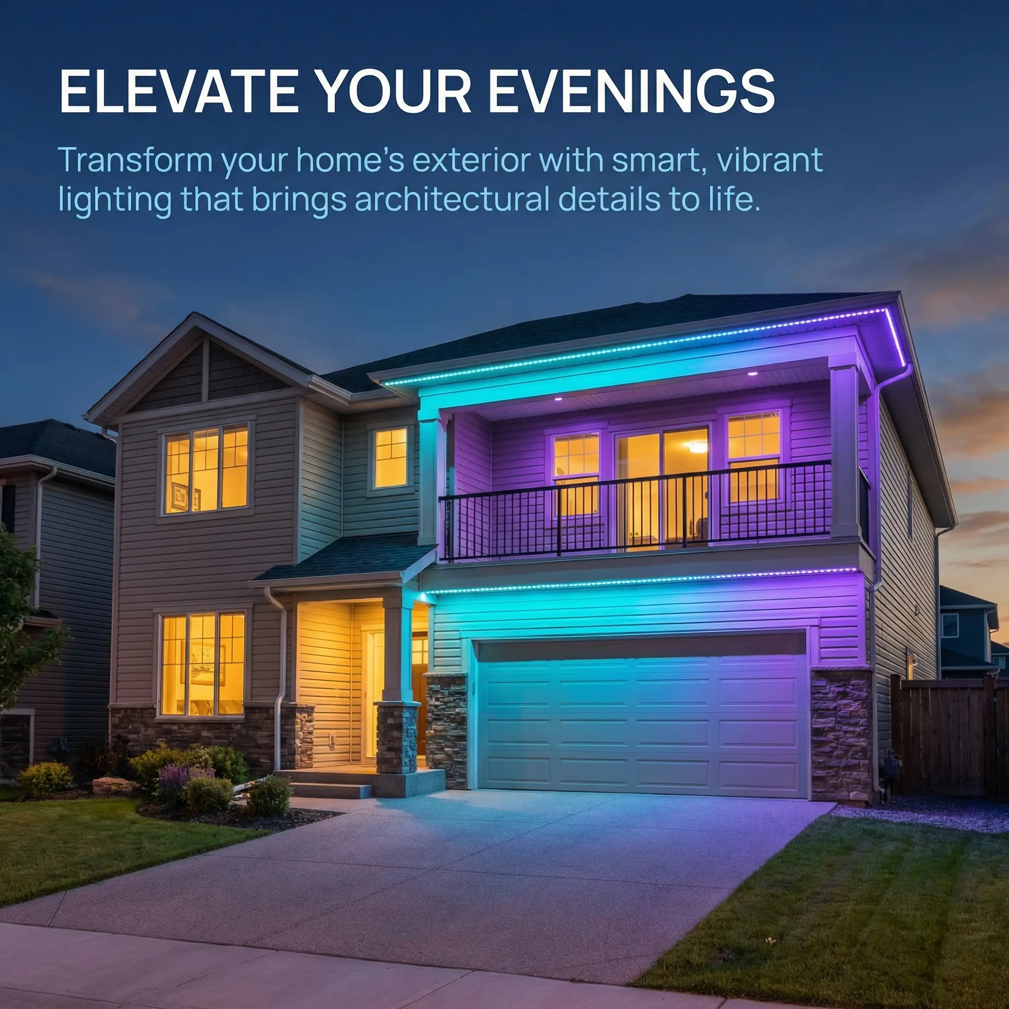 Upgrade your home with these 100ft RGB eaves lights. Perfect for year-round accent lighting and holiday displays. Featuring 60 LEDs, they add vivid colors and a clean outline to your house. These lights are designed for permanent outdoor use, ensuring a sleek, continuous lighting outline that stands out at night.