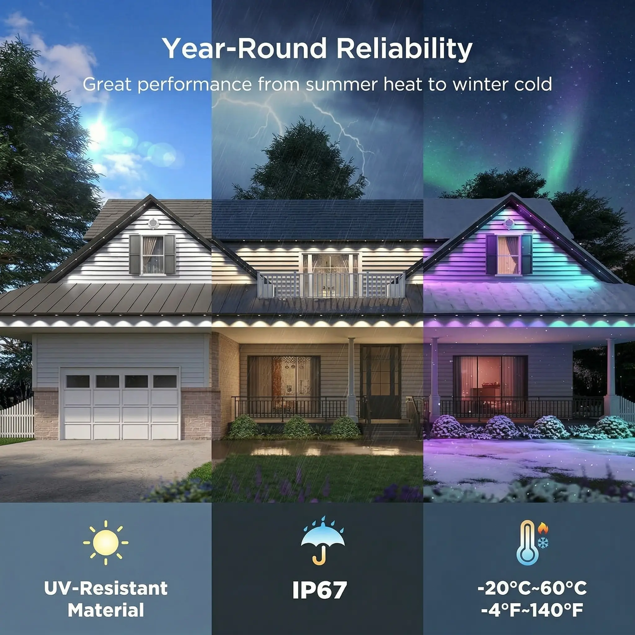 Built for exterior decorative use, these IP67 waterproof LED eaves lights are suitable for rooflines, eaves, porches, garages, and entryways. They create a sleek, continuous lighting outline that helps your home stand out without the temporary look of seasonal string lights. Ideal for year-round house décor.