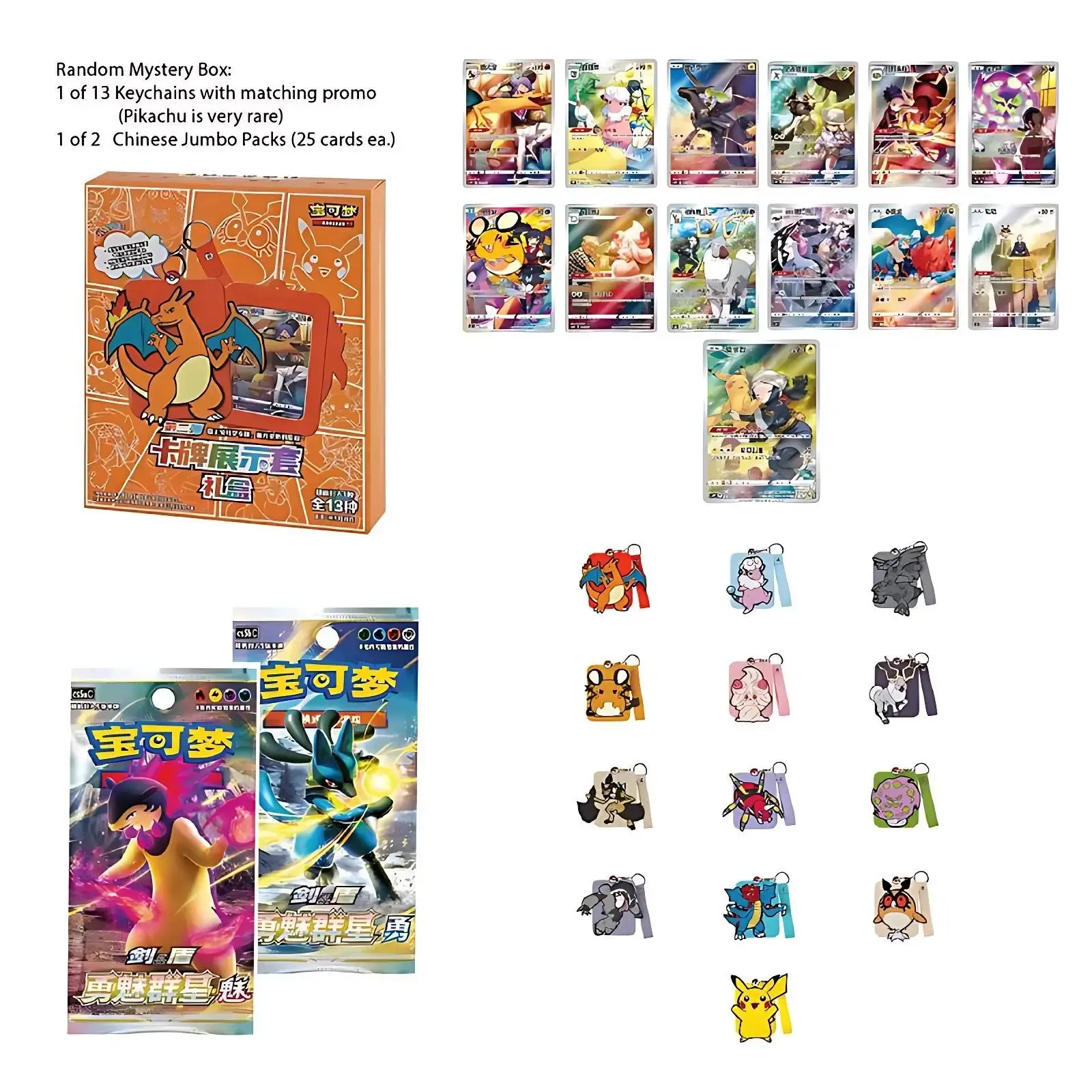 The Display Frame : The centerpiece is a themed silicone protective frame (often called a "card bumper"). It features a Charizard design and comes with a keychain attachment, allowing you to hang it on a bag or display it on a shelf.Random Promo Cards : The box includes one random "Special Illustration" foil card out of a 13-card set. These cards feature beautiful full-art designs of various Pokémon.