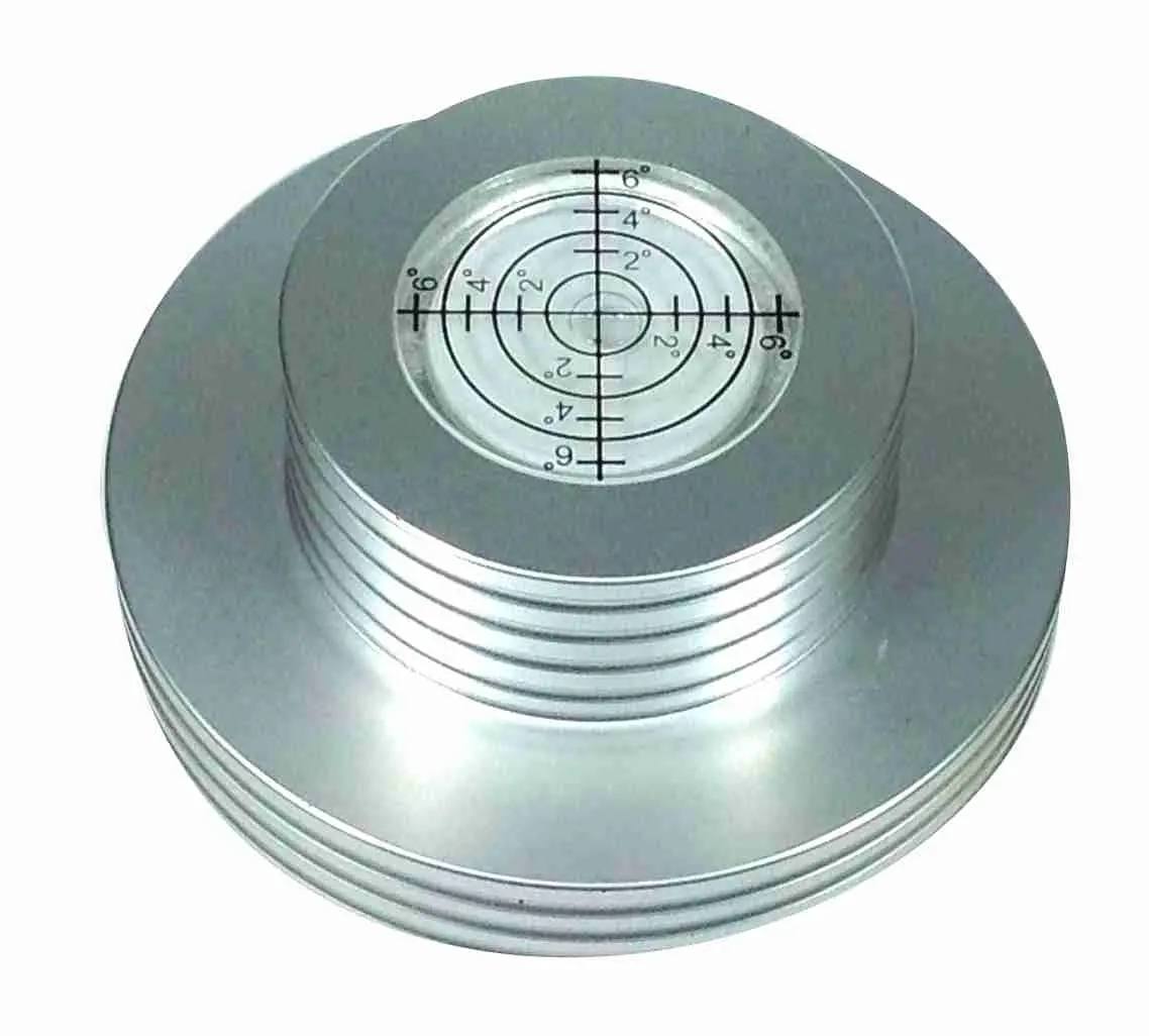 Precision machined from billet aluminum and features a built-in Level Gauge that is ideal for assuring the turntable is sitting level on stand, rack or shelf surface. Groove handle for easy grip and handling. The super-soft cloth base will not scratch LP surface. Natural aluminum finish with clear coat.