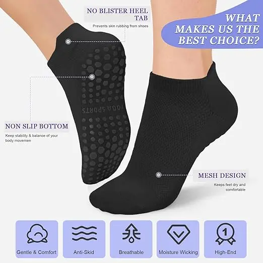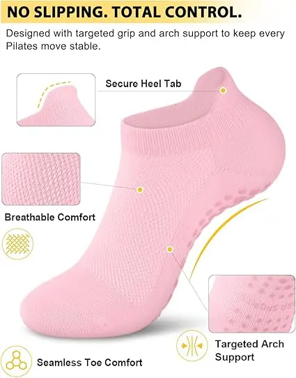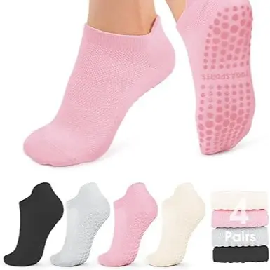 ✨ 4 Pairs Anti-Skid Pilates Grip Socks are ideal for barre, ballet, Pilates, and home workouts. These socks feature a cushioned sole for comfort and a breathable design for your ankles. Perfect for women, they ensure non-slip support during yoga and hospital use. Stay secure and comfortable in every move.