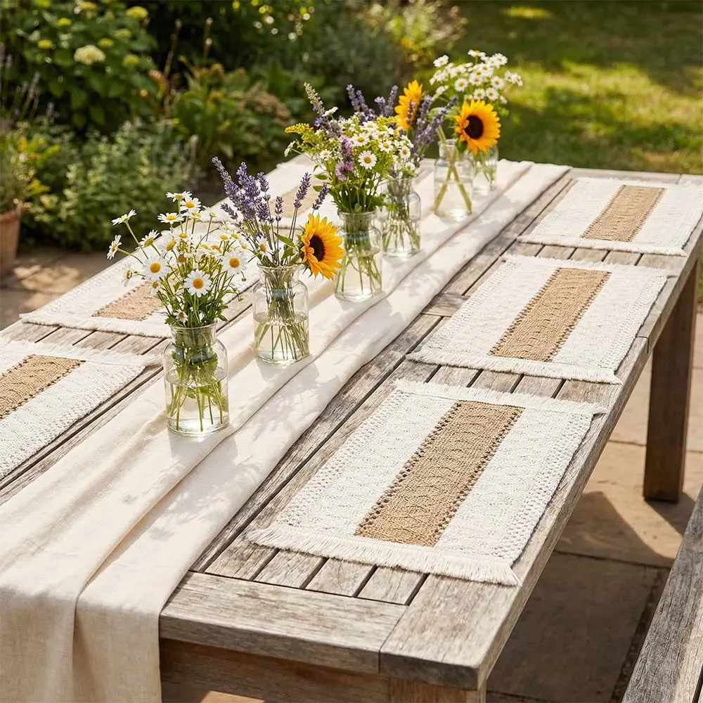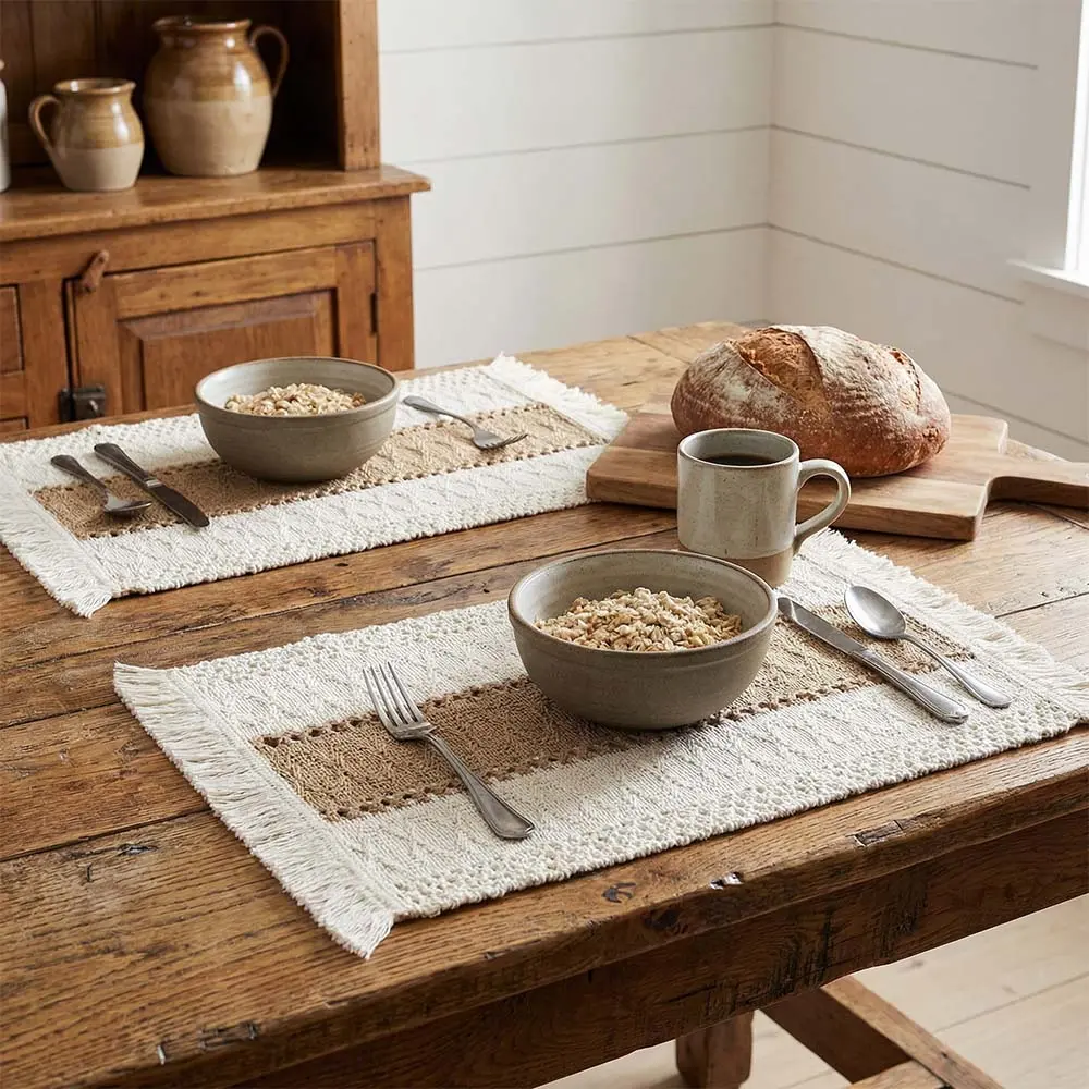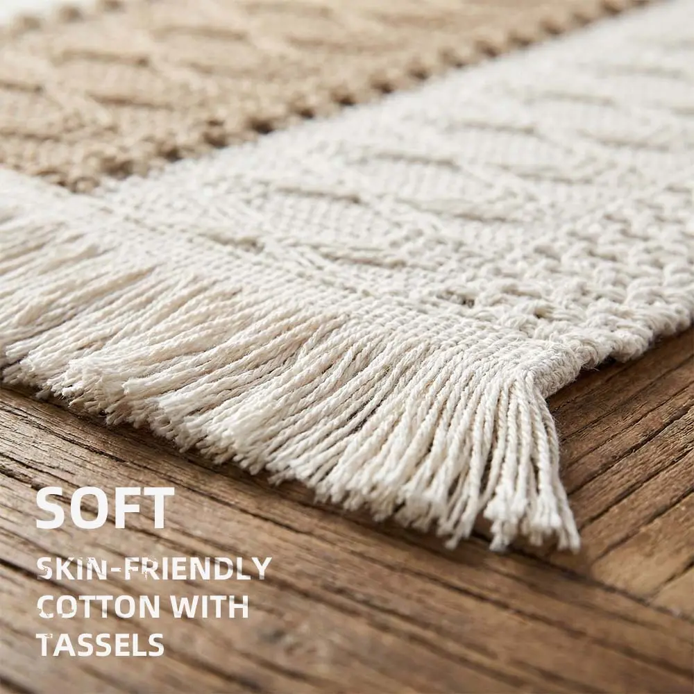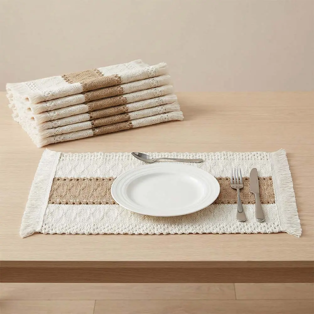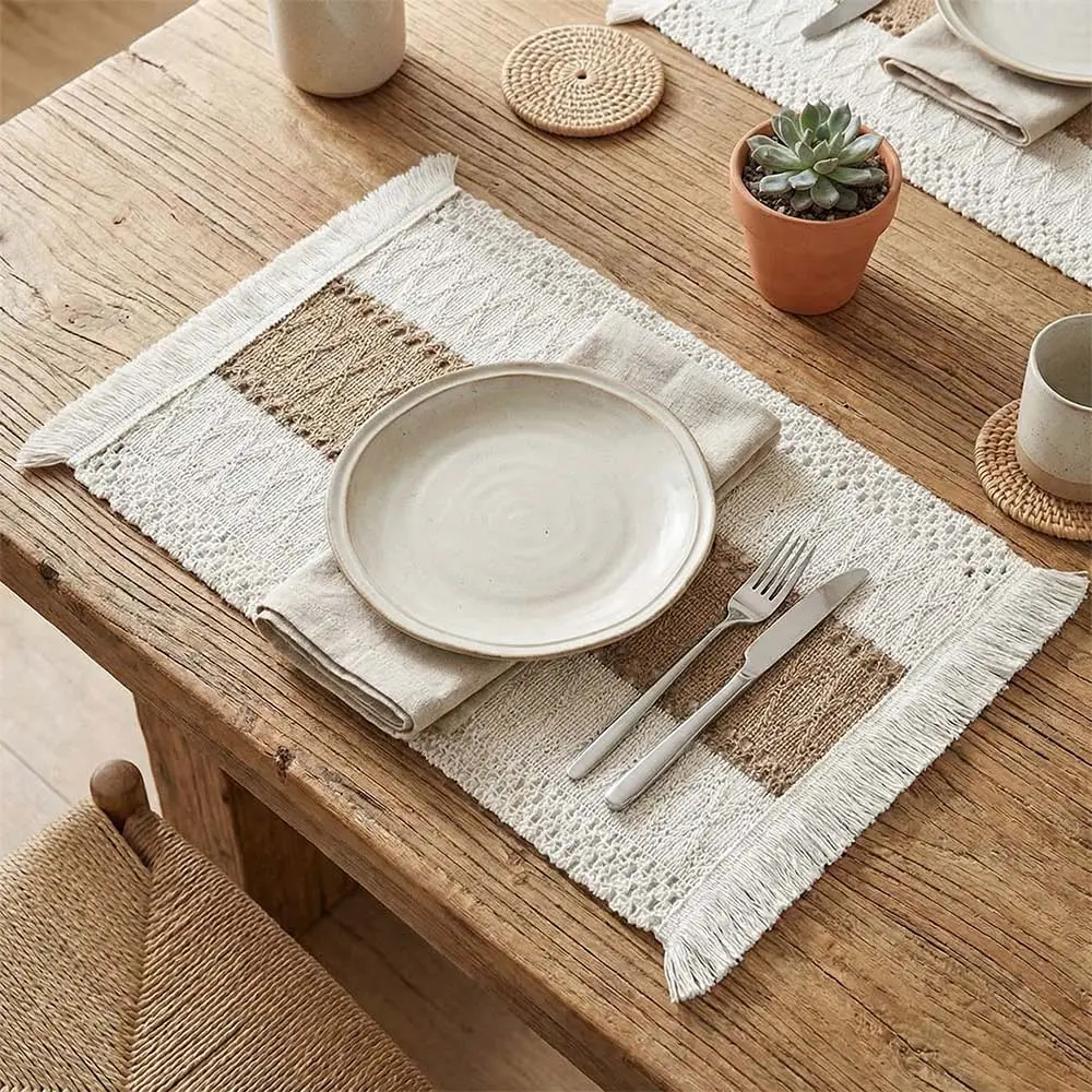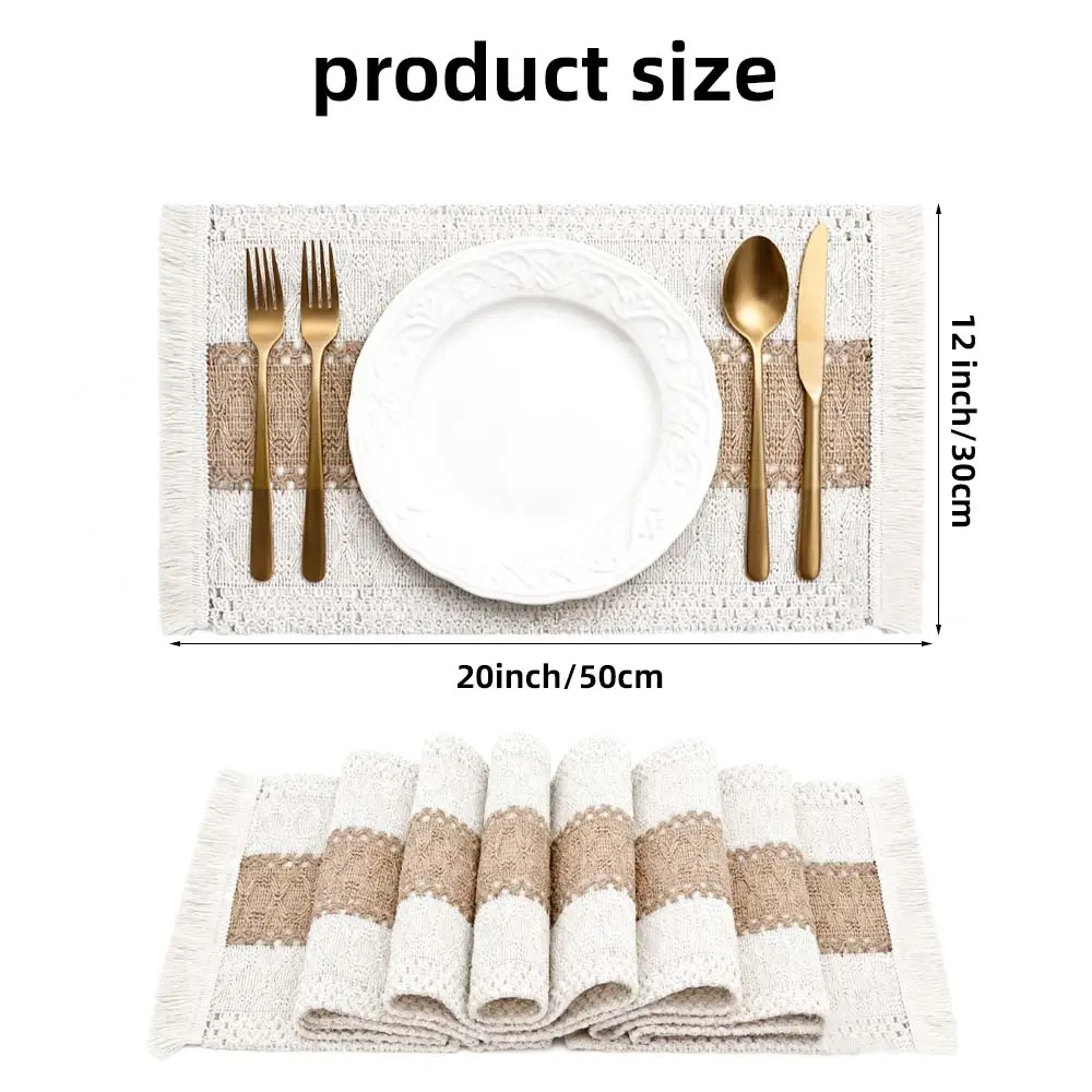 NATURAL MATERIALS: Our placemats are made of 100% natural materials, including soft skin-friendly cotton with tassels and hollow stripes woven from burlap.The color is beige on both sides and brown in the middle