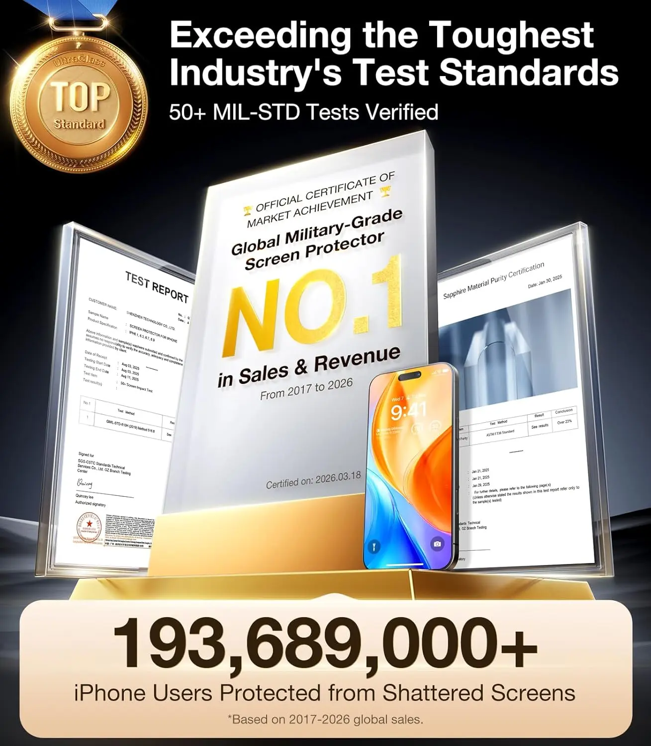 ·[New Record! Survives 14,000+ Drops, Industry NO.1 Military-Grade Shatterproof] Authorized by the international Military Standard with 50+ rigorous engineering tests of 220 lbs impact, 14,000+ drop tests, 25,000+ scratch tests, etc., its strength, toughness and durability perform NO.1 among all glass. Setting an industry record by surviving 12-foot drops from 7 angles on concrete, rock, and wood surfaces, the iPhone 16 Pro Max screen protector ensures unbreakable protection from every edge!
