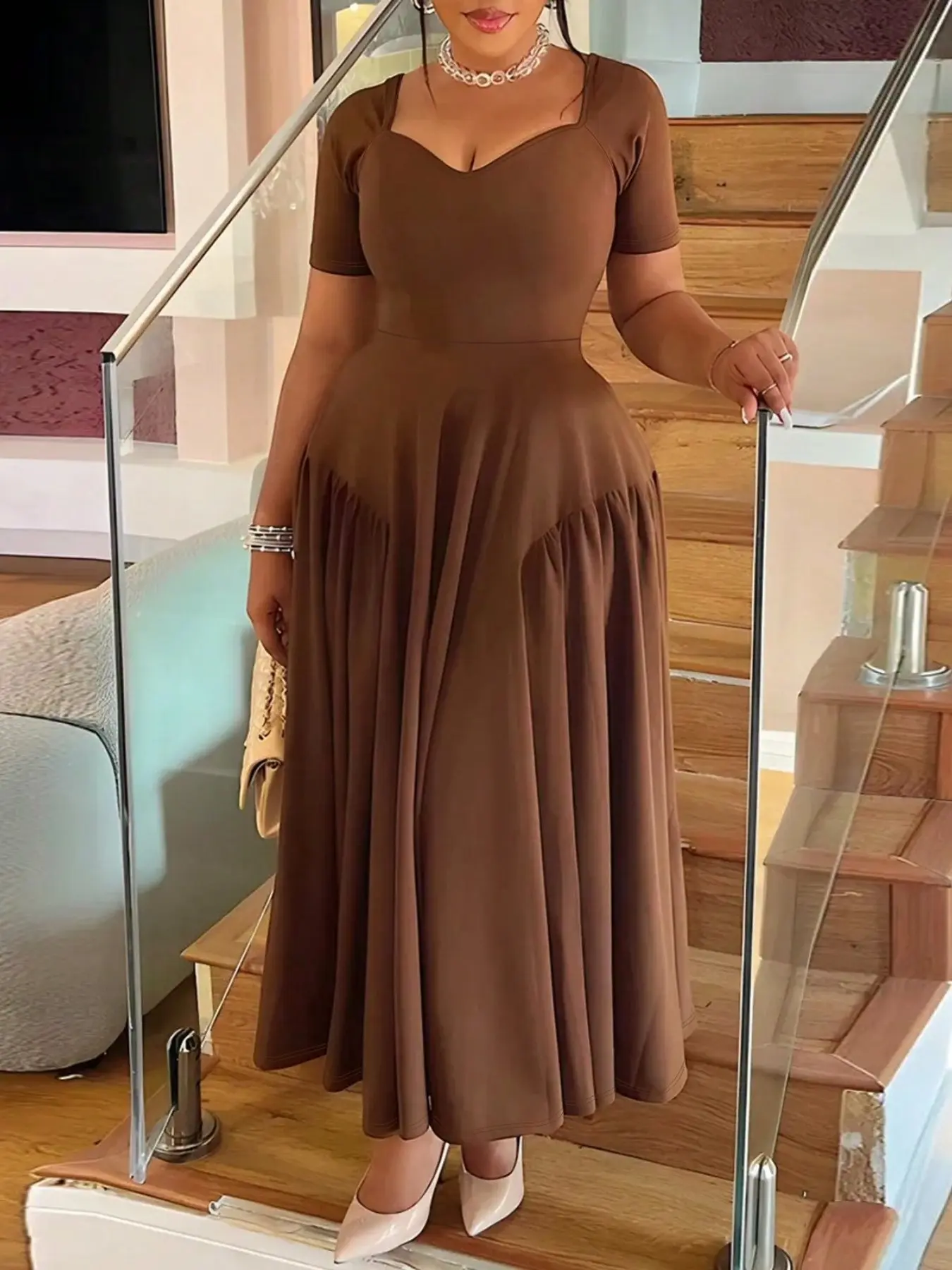 Plus Size Square Neck Heart Collar Short Sleeve Fitted Waist A-Line Midi Dress, Elegant Slimming Long Dress for All Seasons