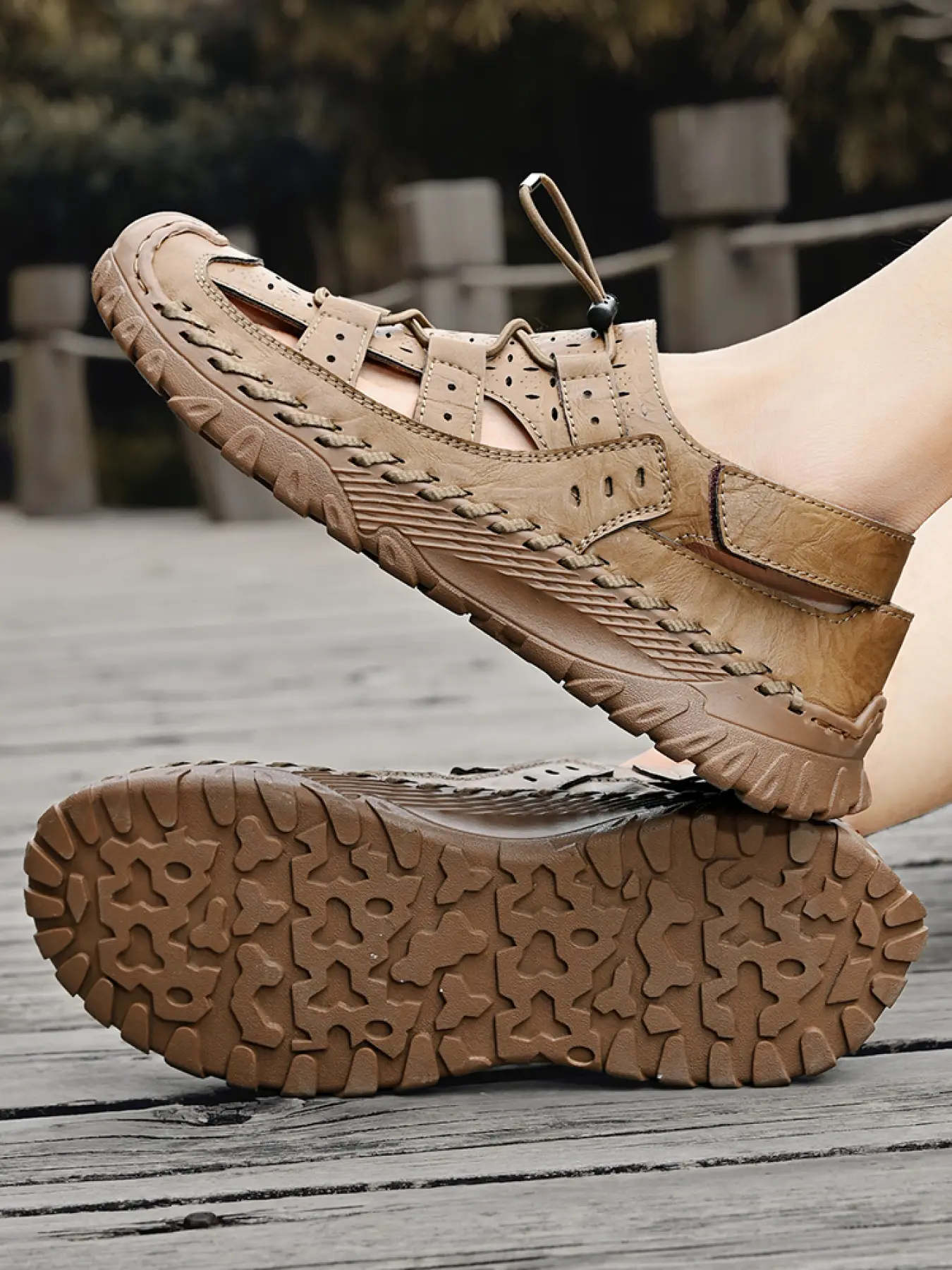 Men's Solid Color Hollowed-Out Closed-Toe Outdoor Sandals, Drawstring Velcro Non-Slip Beach Shoes, Hand-Stitched Thick-Soled Dad Shoes