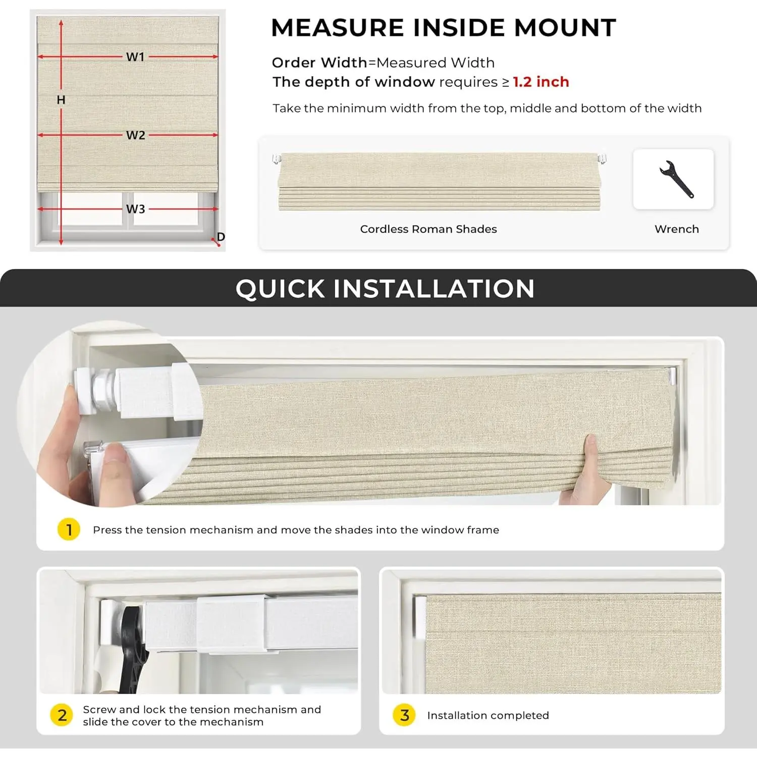Transform your windows with our 100% Blackout Cordless Roman Shades. Perfect for windows measuring 34.5" W * 72" H, this beige shade offers complete blackout. No tools or drilling required, making installation a breeze. Ideal for those seeking a hassle-free solution for window treatment.