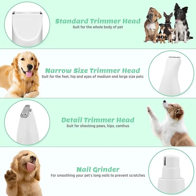 ·【4 in 1 Small Dog Grooming Kit】This paw trimmer for small dogs quiet include 3 trimmer heads and 1 nail grinder head that can be replaced, adopts a detachable cutter head design with 4 replaceable cutter head attachments — standard cutter head,narrow cutter head,small(details) cutter head and nail grinder head, which can be quickly replaced with just one pull and one push to meet the needs of dog and cat body trimming.