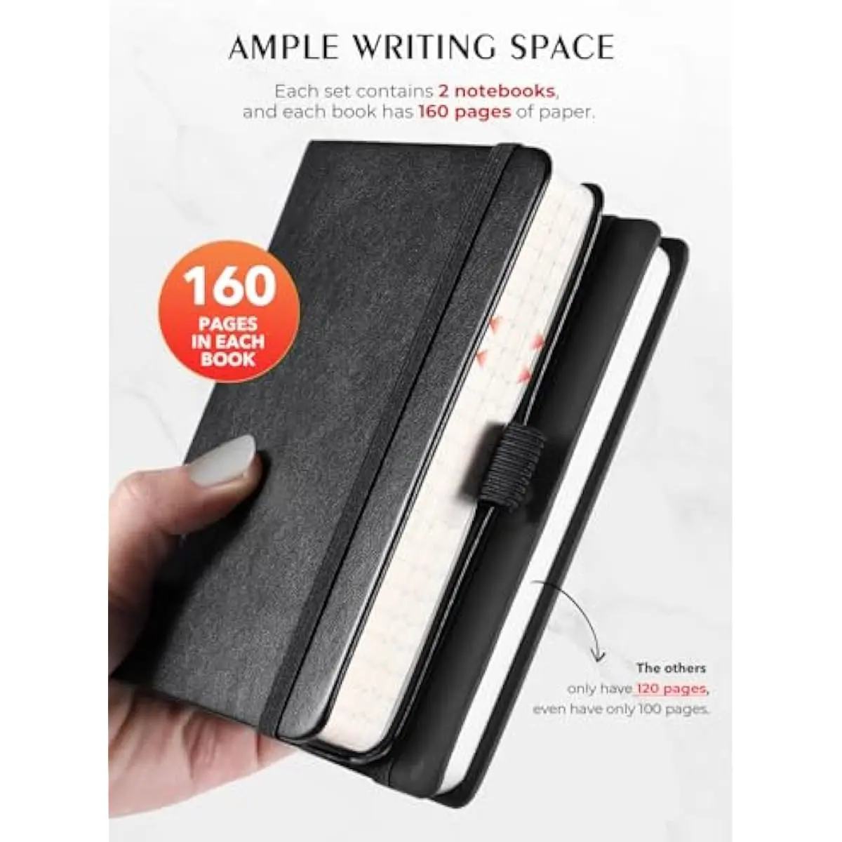2 packs, High-quality paperThe small notebooks are shipped in packs of 2, with 80 sheets each, totaling 160 individually numbered pages. The papers are thick enough so the ink wont bleed through! Additional features include: Front & Back Pockets & Pen Loop.