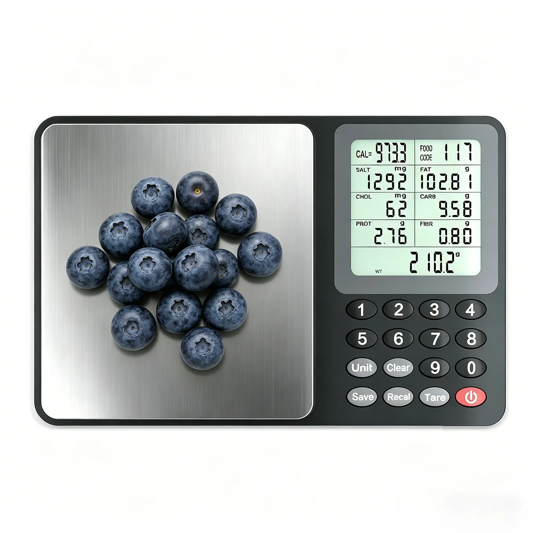 This scale features a built-in nutritional calculator that displays calories, protein, fat, carbohydrates, cholesterol, salt and fiber for 999 pre-programmed foods, making it convenient to view and record daily nutritional data.