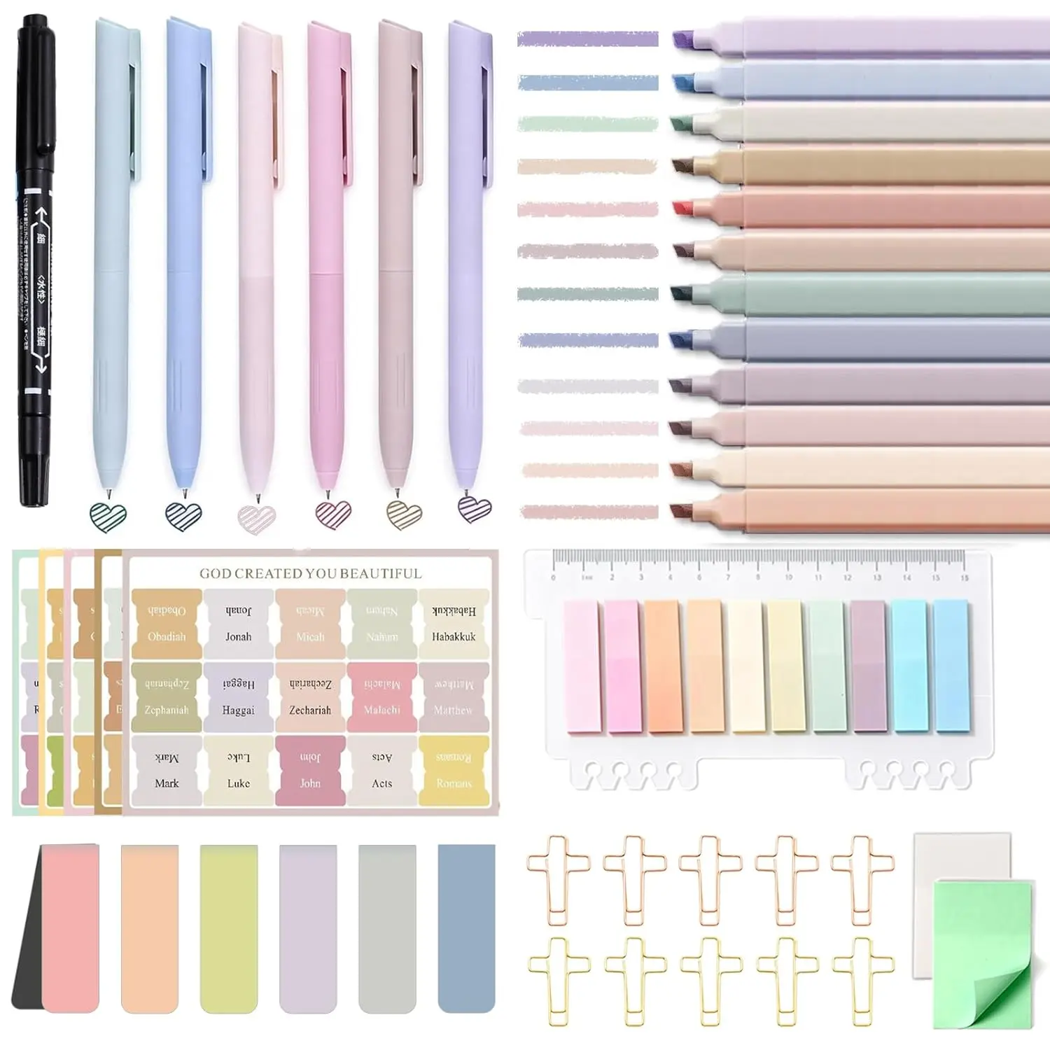 ·All-in-One Bible Study & Journaling Kit: This bible study supplies set includes 12 no bleed pastel highlighters, 6 colored gel pens, 1 dual-tip black permanent marker, 5 sheets of bible tabs, 6 custom magnetic bookmarks, 10 cross-shaped paper clips, 1 ruler sticky note pad, and 2 transparent sticky note pads—everything needed for organized scripture study and journaling.