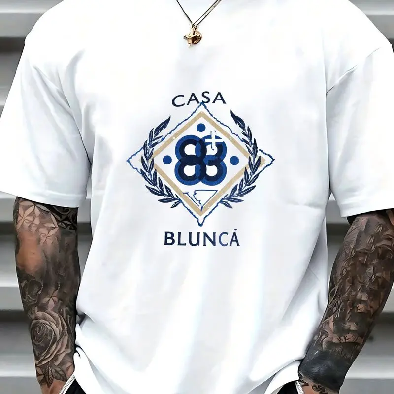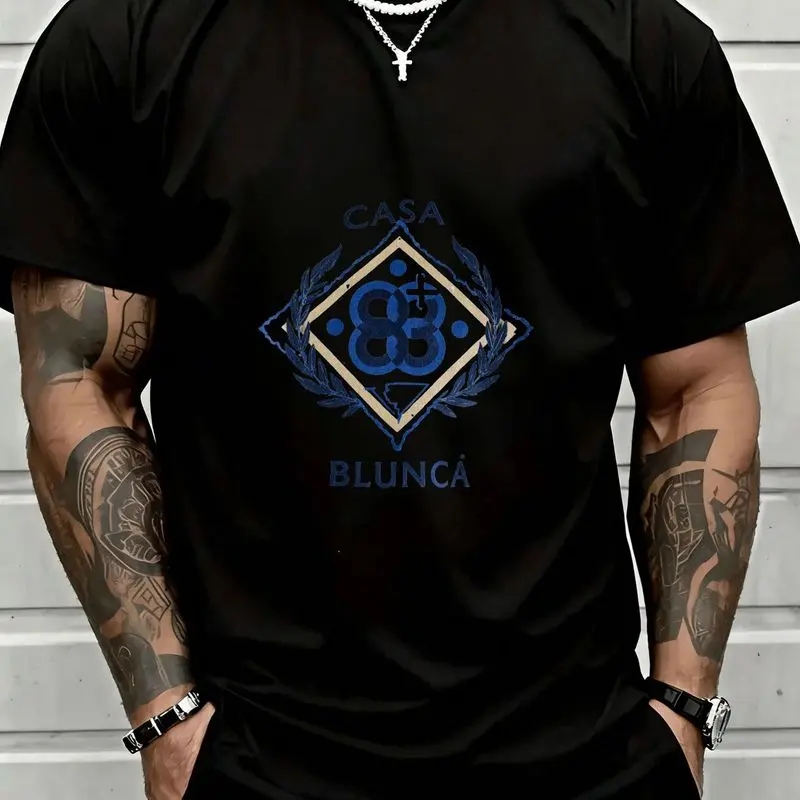 Modern Geometric Monogram "CASA BLUNCÁ" T-Shirt - Premium 100% Cotton Crew Neck Tee, Soft Breathable Fabric with Navy Blue & Gold Emblem Design, Casual Streetwear Style Perfect for Summer Days and Outdoor Activities