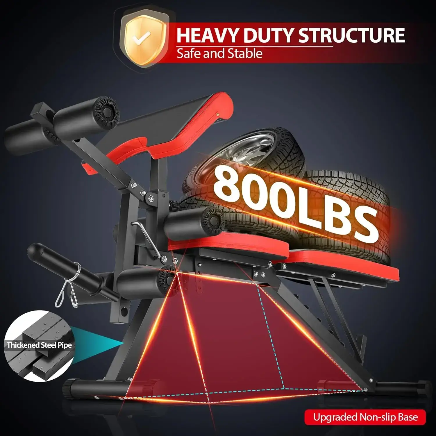 [Multi-Functional Training]This weight bench is suitable for exercises such as preacher curls, single-arm rows, dumbbell bench presses, leg extensions, and leg curls, helping you achieve comprehensive fitness results. [Sturdy and Stable]This weight bench constructed with a sturdy metal frame and a stable triangular structure, the upgraded base adapts to uneven floors.The workout bench supports a maximum weight of up to 800 lbs, ensuring safety and stability. [Multiple Angle Adjustments]The backrest of this weight bench can be adjusted to 7 different angles, the seat cushion of this weight bench to 4 angles, the leg training machine's foam of this weight bench to 2 angles, and the preacher pad of this weight bench to 3 angles, meeting the needs of users of different heights and training requirements. [Detachable Preacher Pad]The preacher pad of this workout bench is detachable, allowing you to remove it during leg curls for better training efficiency. [2-in-1 Weight Rod] The leg training machine comes with a 2-in-1 weight rod, making it suitable for both Olympic weight plates and standard weight plates, offering versatility in training. [Easy Mobility]Equipped with wheels at the base, the weight bench can be easily moved, making it convenient to adjust its position at home. [Premium Leather Material]This workout bench made with premium leather material, it is sweat-resistant, durable, and soft, providing a comfortable workout experience. [Easy Assembly]All necessary small parts are packaged in blister to avoid spilling and loss, and the accompanying manual is concise and clear, all necessary assembly parts included to help you quickly set it up and start your workout routine without any hassle. (NOTE: BARBELL DUMBBELLS AND WEIGHTS ARE NOT INCLUDED)