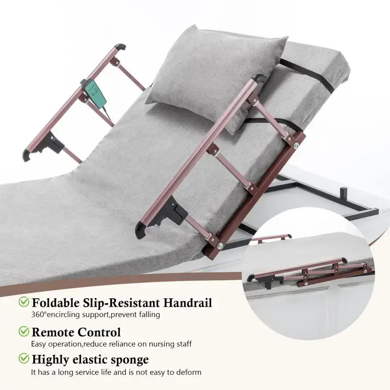 Assembled Length (in.)- 74.00 Assembled Width (in.)- 35.00 Assembled Height (in.)- 12.00 Weight (lbs) - 35.26 Color - Grey Suitable for the crowd - Glderly pregnant women with mobility etc. Material - Carbon Steel, Sponge, Fibre Cotton, Imitation Cotton and Linen Process - Electrostatic Paint Moulding Assembly Required - Yes Power Source - Corded Electric Plug Type - US Standard Mounting Type - On the Bed 1*Electric Lifting Backrest 1*English Manual