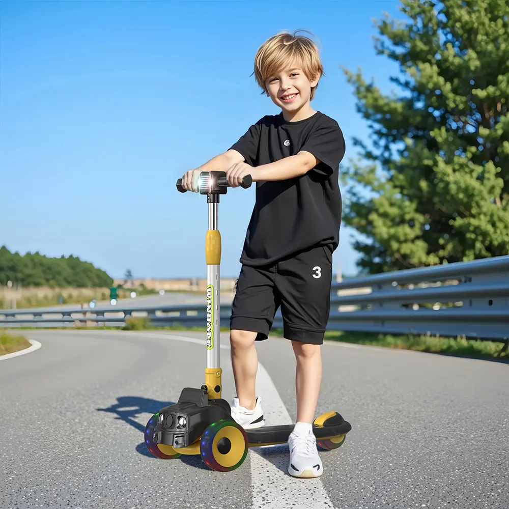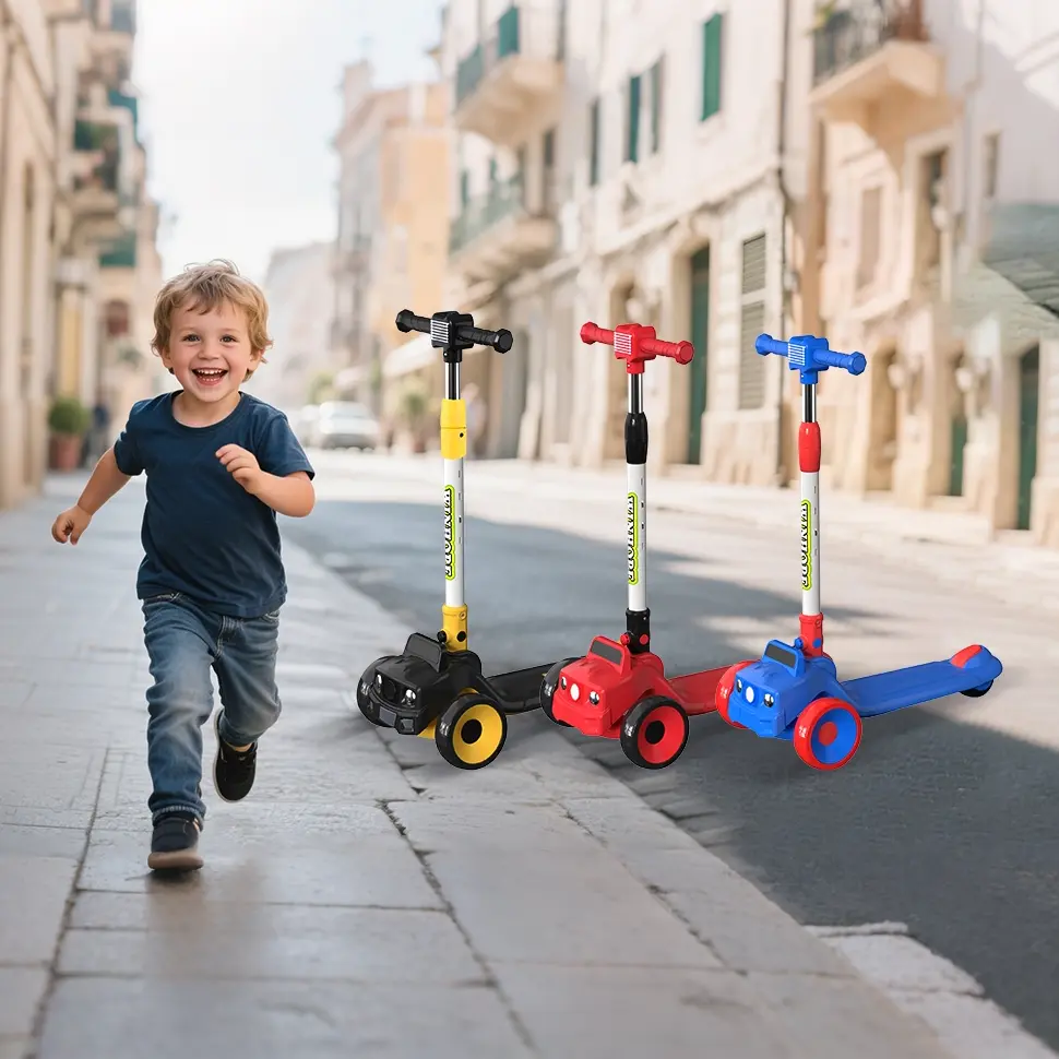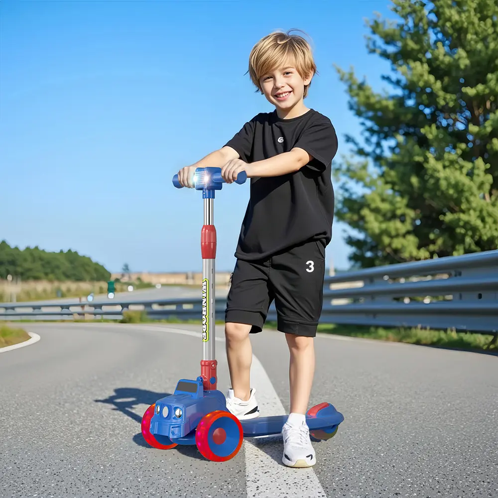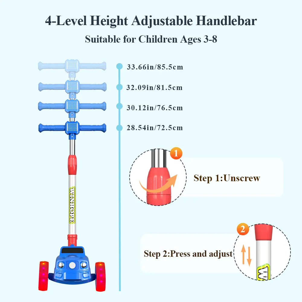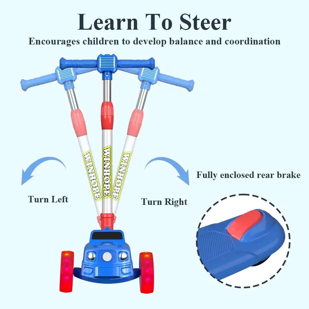 WINHOPE children’s scooter, drawing inspiration from a cute car design, specially crafted for kids aged 3–8, combining safety, fun, and portability. Stable three-wheel design, adjustable four height levels, one-button folding, flashing wheel design—it’s the best choice for children learning to ride a skateboard, supporting their happy growth.