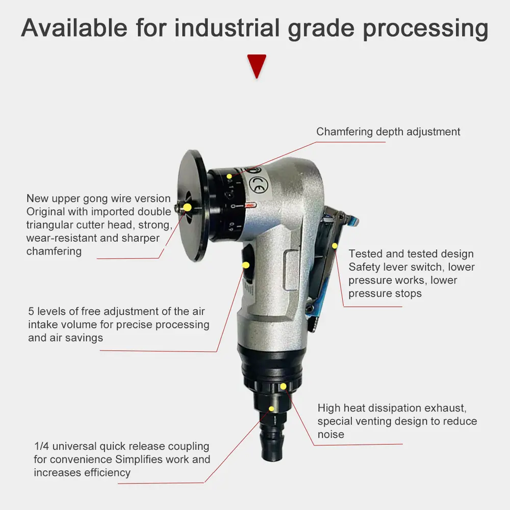 1. Versatile: This pneumatic chamfering machine can chamfer R/C angles, round holes, irregular edges, arcs, and straight edges on a variety of materials including steel, aluminum, copper, acrylic, and wood.