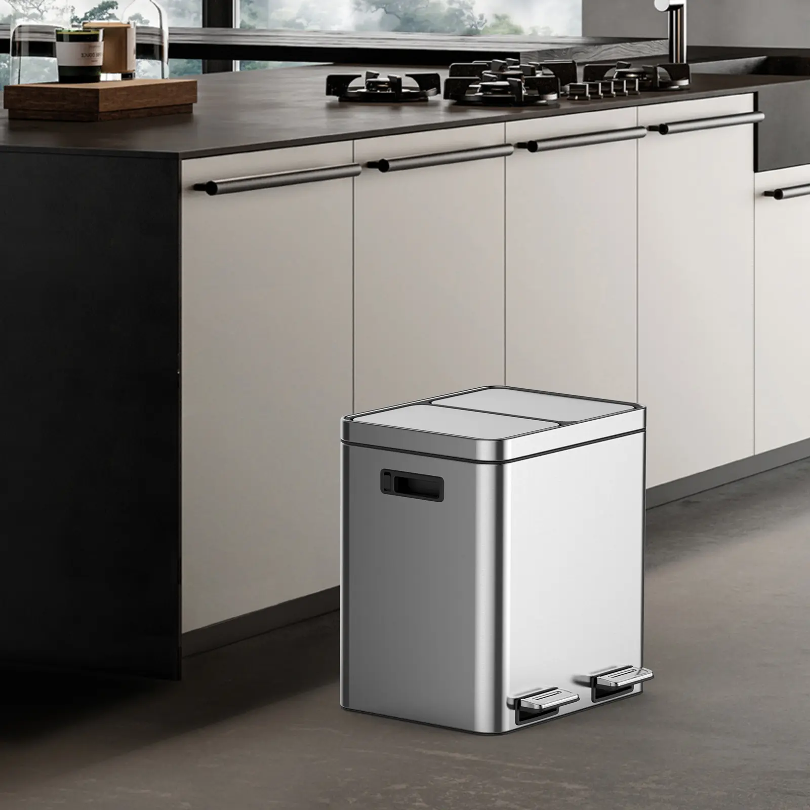 No more messy trash sorting! This dual pedal bin has 2×15L separate compartments, hands-free operation, durable stainless steel, easy to clean. 30L large capacity, perfect for kitchen, home, office. Make your kitchen organized now! 🗑️✨**