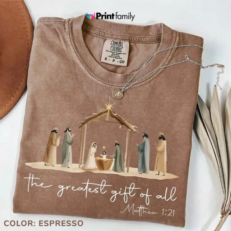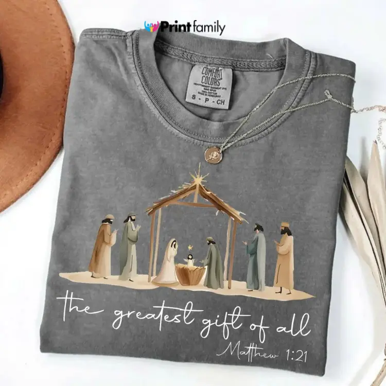 5. Comfort Colors Vintage Greatest Gift Of All Bow Nativity Coquette Christmas Graphic Tee Hand Drawn Manger Scene T-shirt Christian Holiday Top - Printfamily