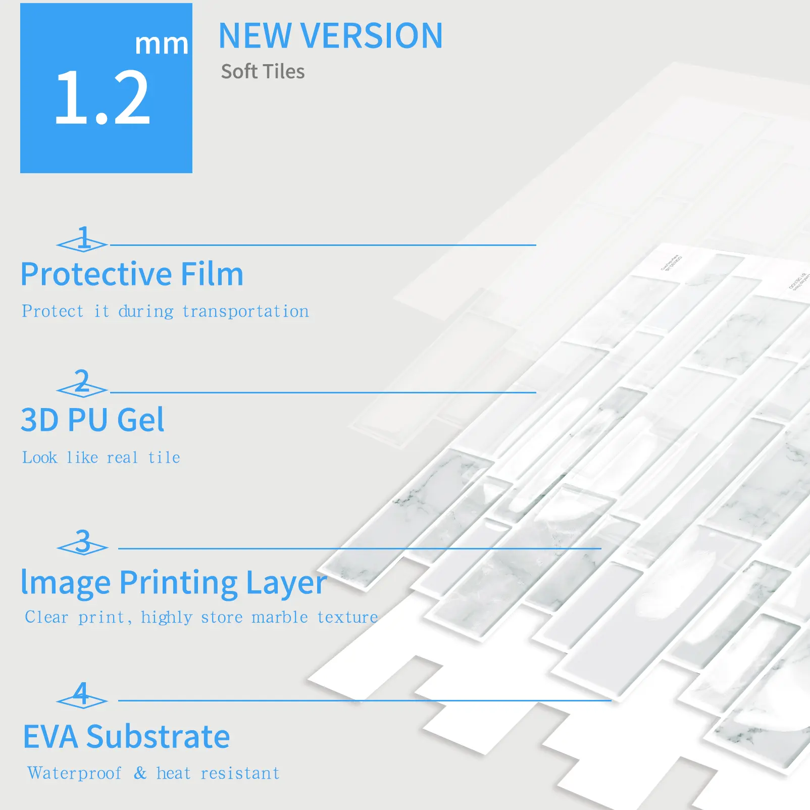 Protected by a transparent 3D crystal gel coating, these tiles are perfect for kitchen backsplashes, bathroom walls, laundry areas, accent walls, furniture, cabinets, and any other smooth, dry surfaces. Note: Not suitable for use on rough or freshly painted walls. *