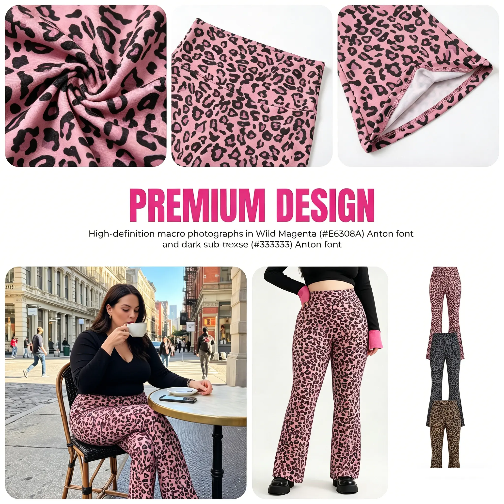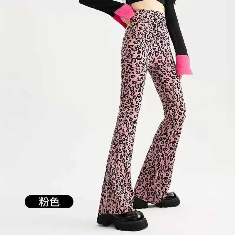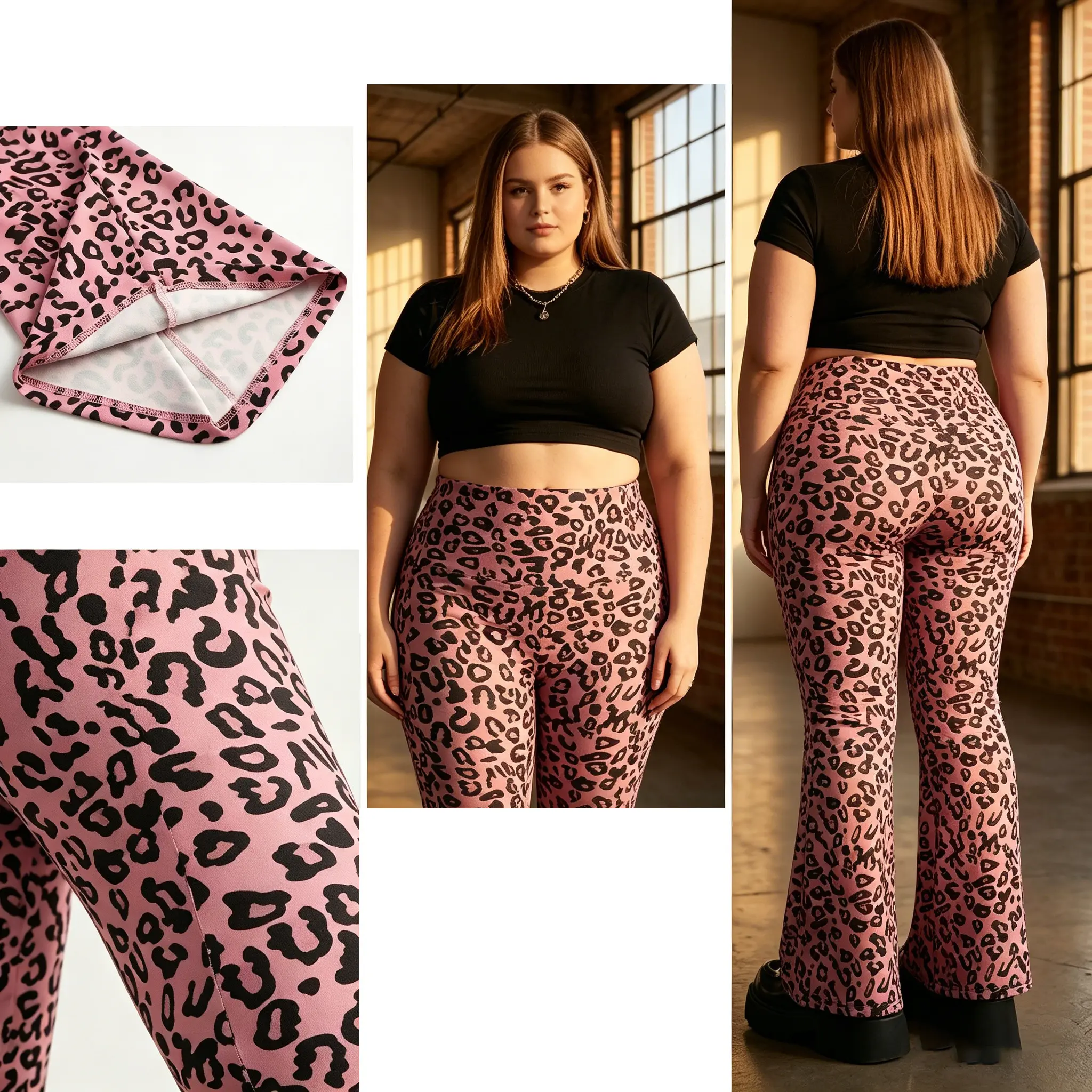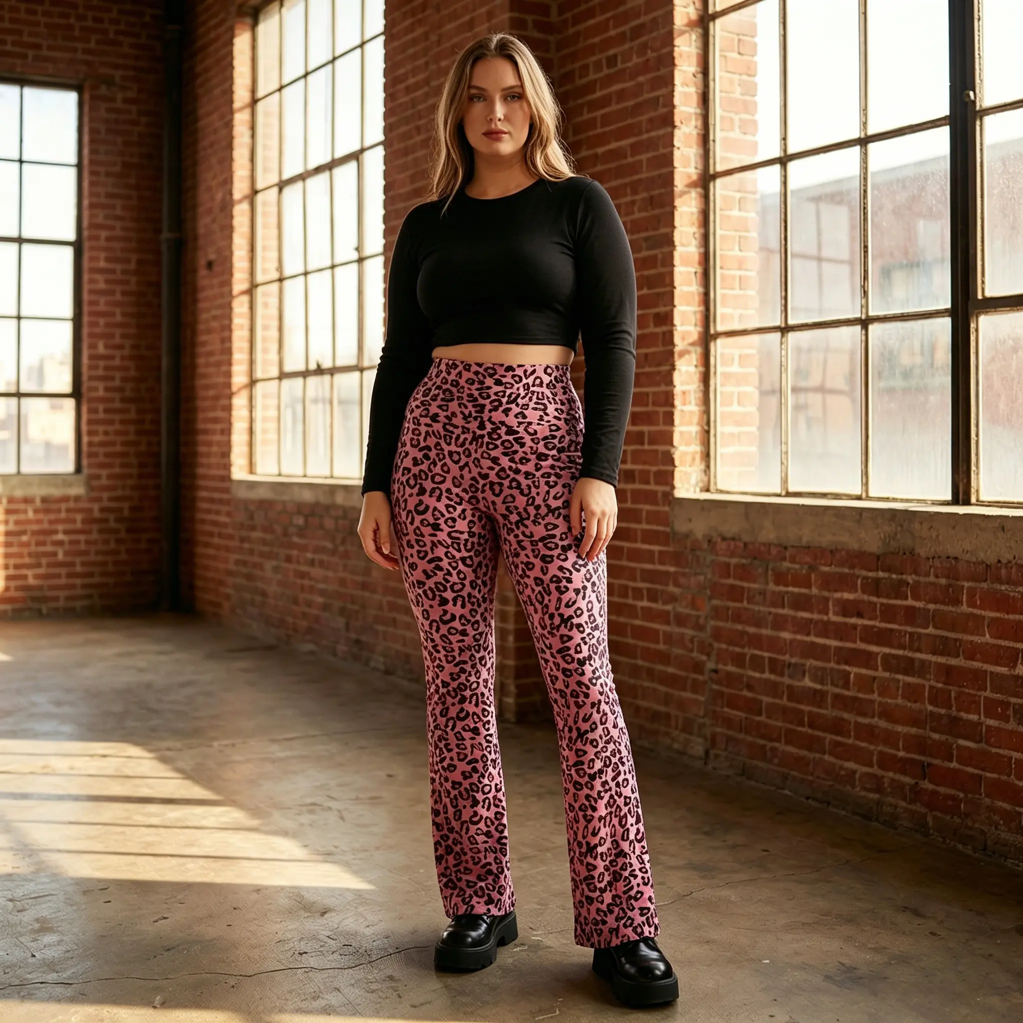 Using classic Leopard Print leopard print elements and sweet pink collision to create a highly recognizable High Fashion style; Flare Leg micro flared pants shape the leg lines, visually elongating the legs; High Waisted waist cut perfectly wraps around the abdomen, showcasing a curvaceous figure