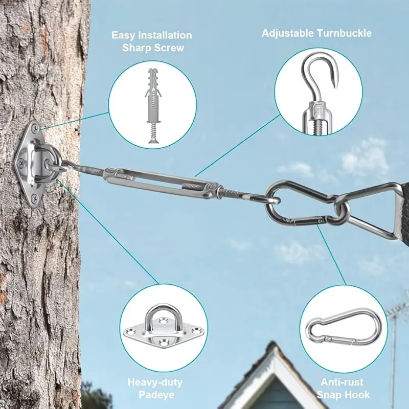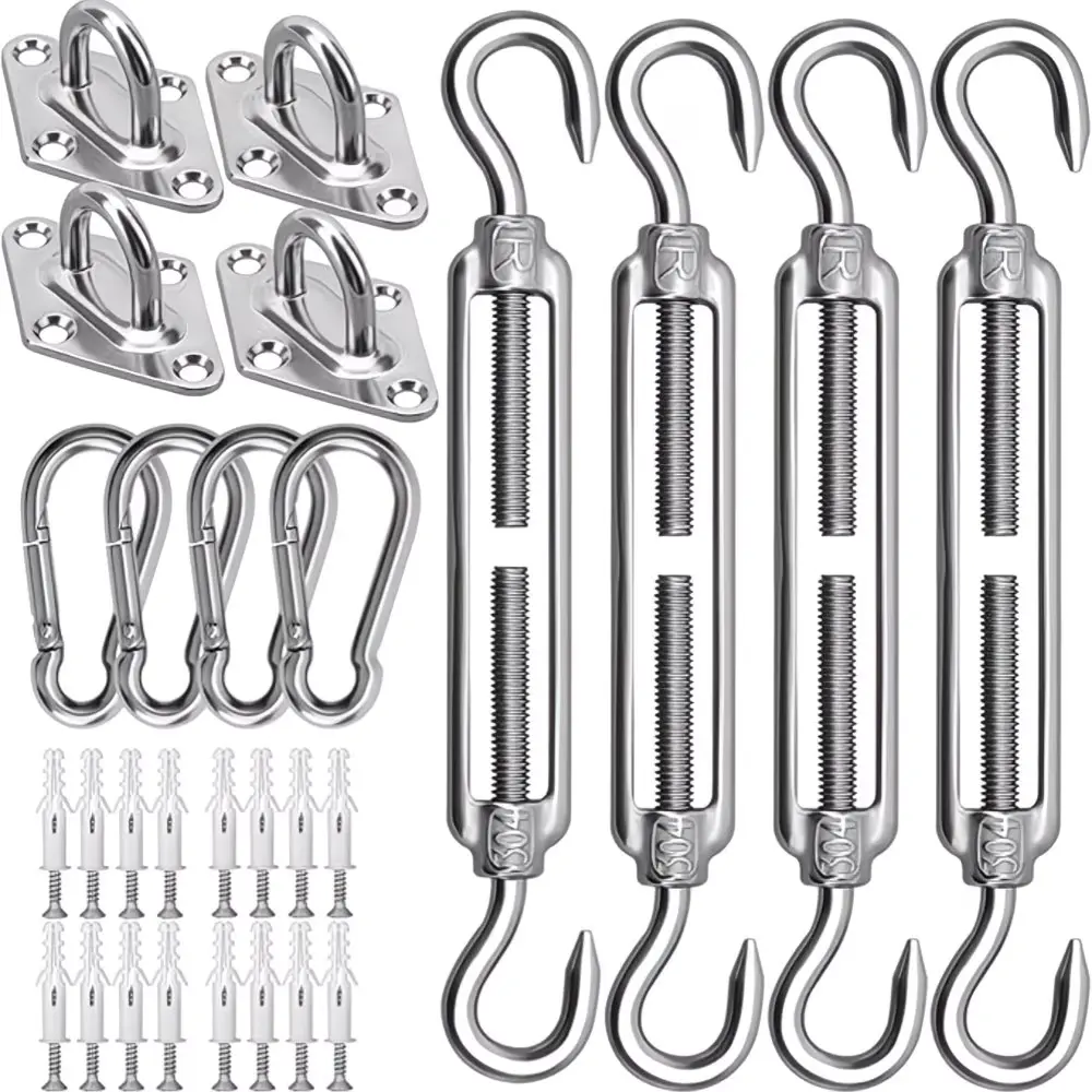 sun shade hardware kit - Adjustable turnbuckle for shade sail x 4pcs, Pad eyes x 4pcs, Snap Hook x 4pcs, Phillips head helical spiral threads screw x 16pcs, Plastic expansion x 16pcs, rectangle Shade Sail Hardware Kit contains 44 pcs of well made components.