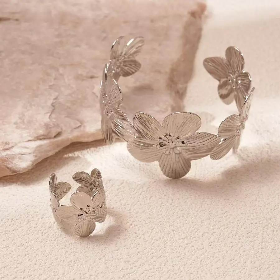 Women's Jewelry Set Bohemian Style Adjustable Open Metal Flower Bracelet and Ring Set Suitable for Daily Wear and Gift-Giving