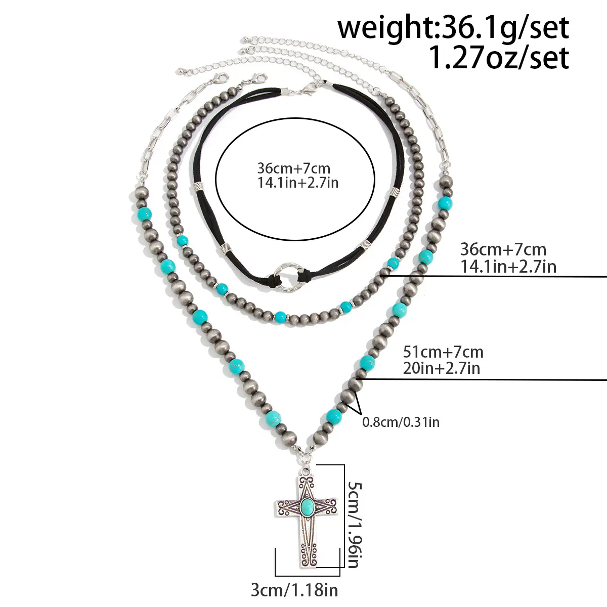 Western Boho Turquoise Cross Necklace Set: You will get 3 necklaces in one order, Featuring navajo pearl necklace,a black cord choker and a detailed silver cross pendant, it embodies the timeless spirit of the American Southwest.
