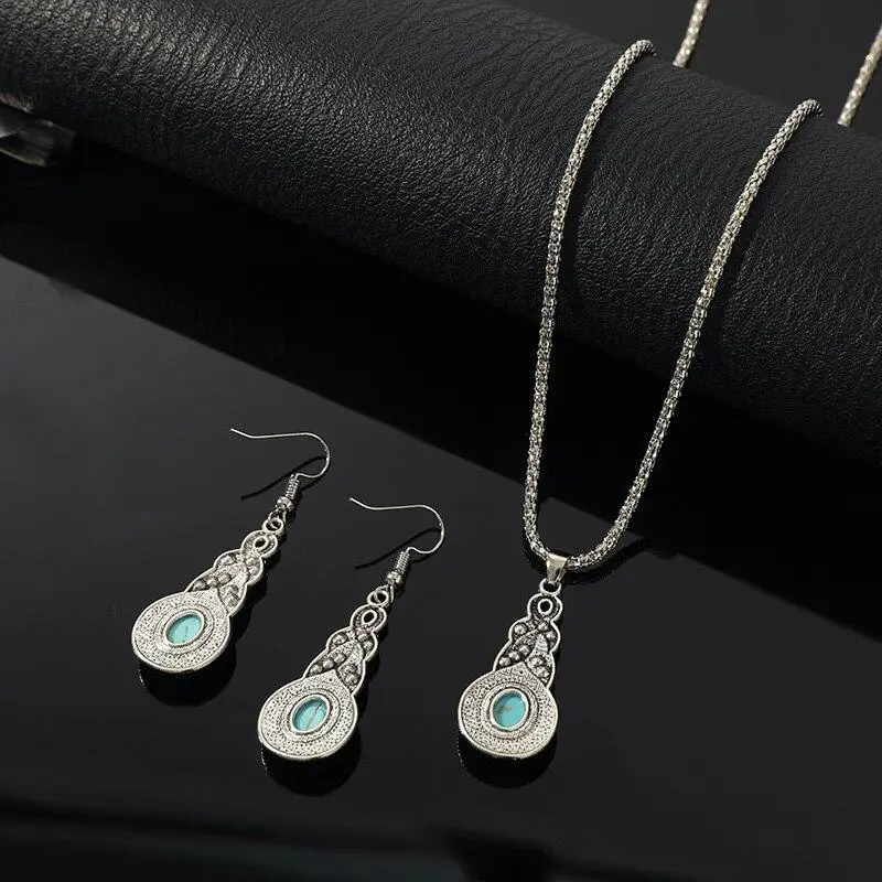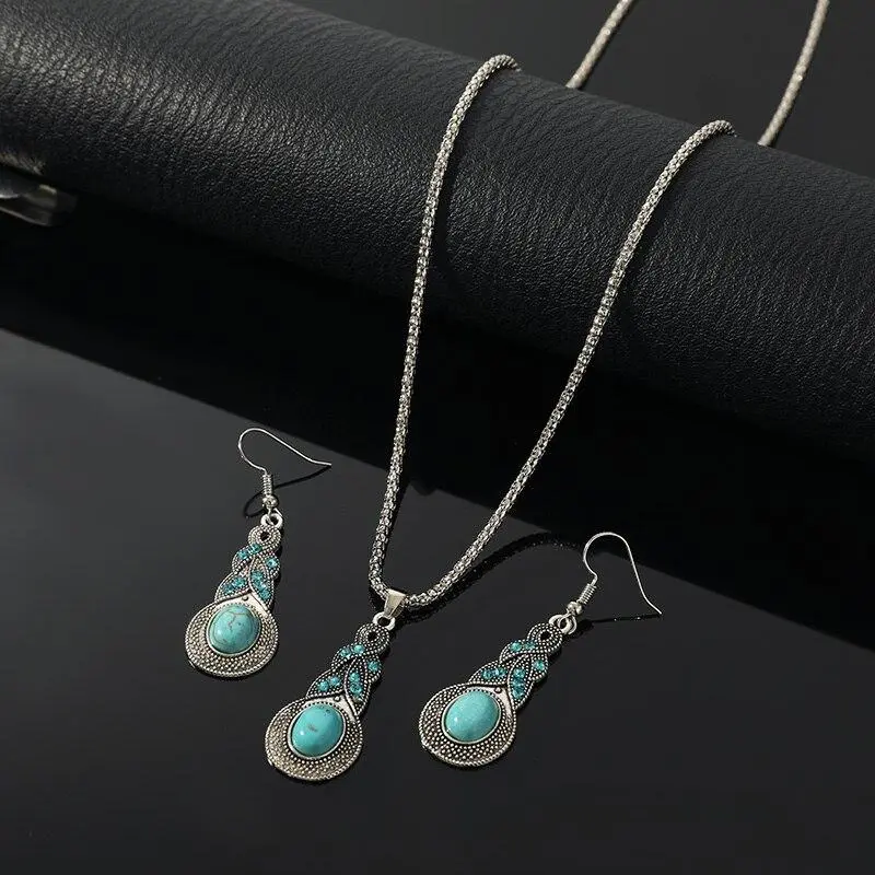 3pcs Necklace Earrings Set For Men And Women Vintage Style Blue Crystal Inlaid Turquoise Pendant With Lantern Chain Jewelry