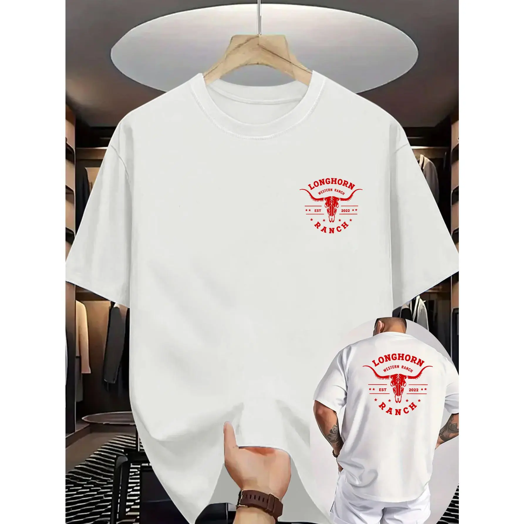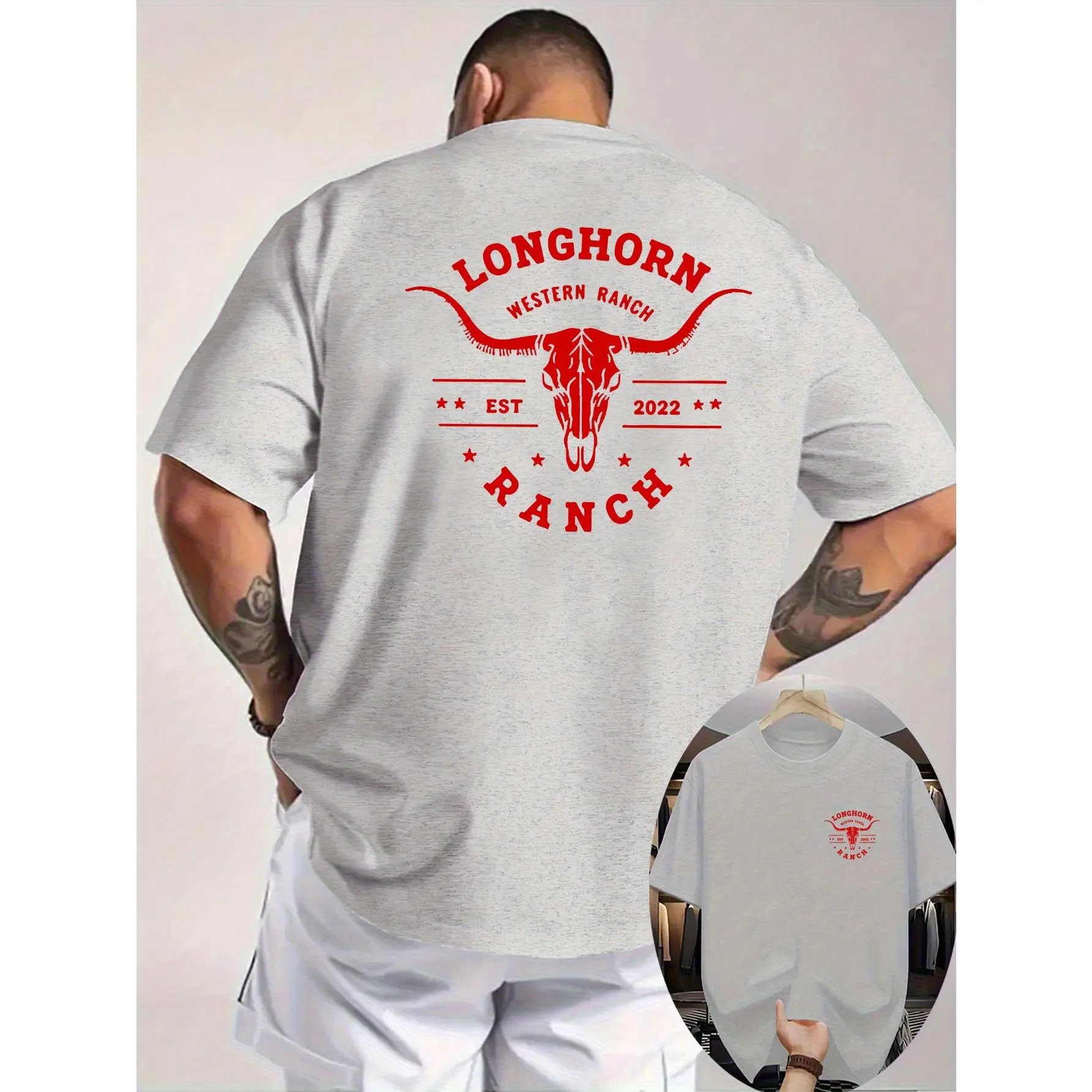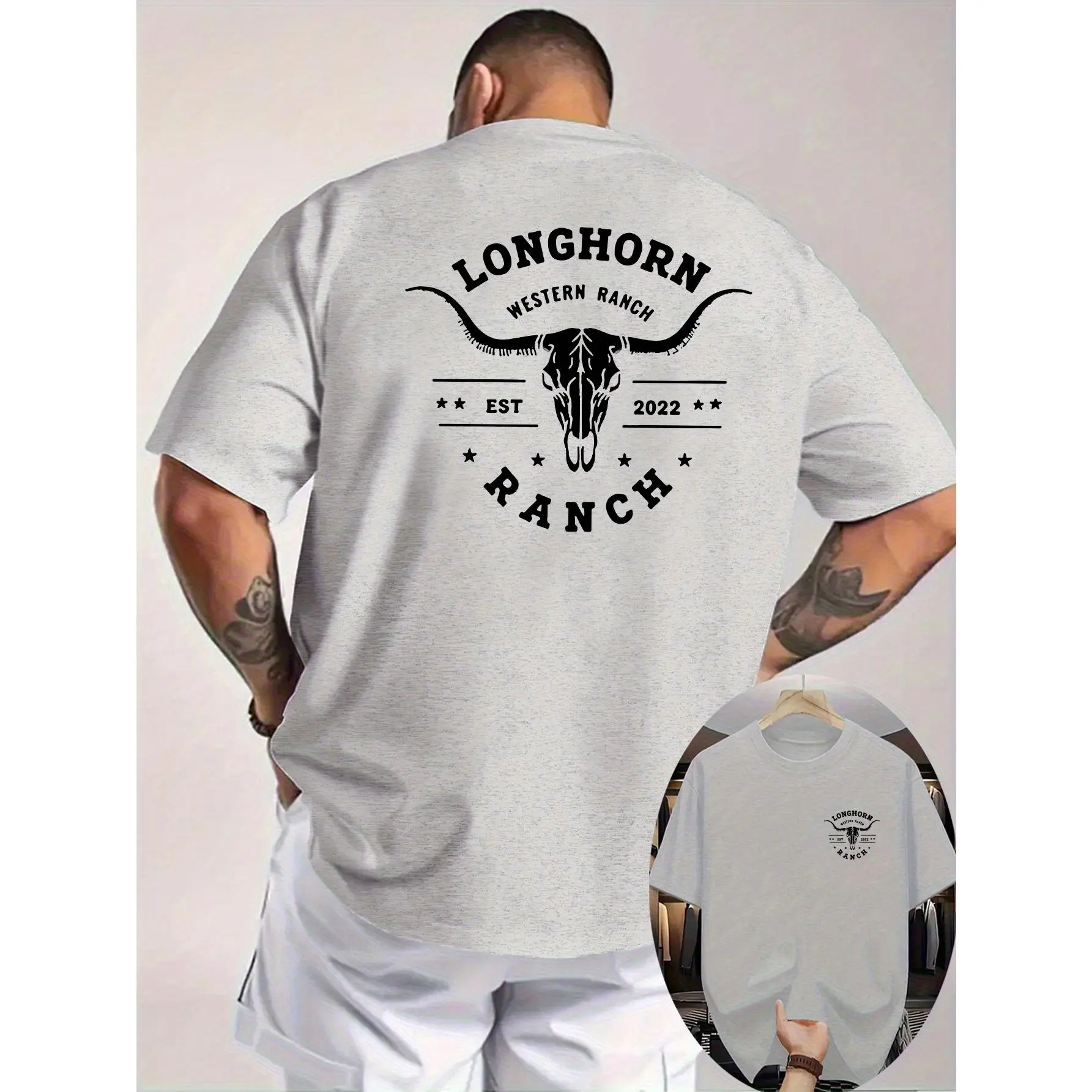 [PeakPro T-shirt]-Men's Western Cowboy Graphic T-Shirt - Longhorn & Bull Skull Print with Texas Ranch Design, Breathable Knit Fabric, Double-Sided Short Sleeve Shirt for Summer Outdoor Activities, Casual Round Neck Tee for Ranch & Wester