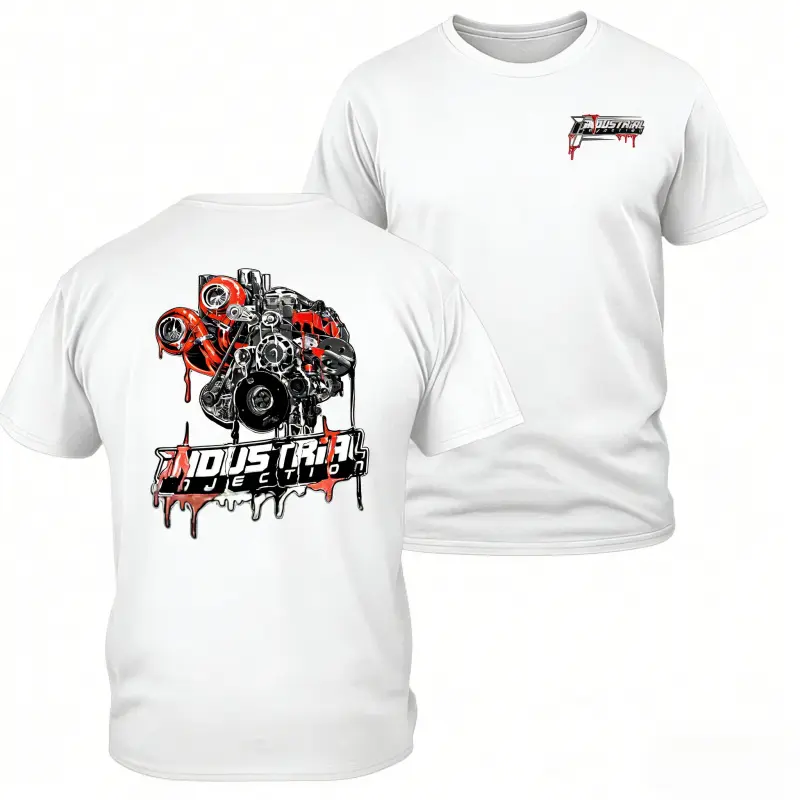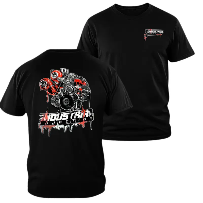 [PeakPro T-shirt]-Industrial Injection T-shirt, 2 Sides, Front Chest Logo and Back Dripping Turbo Diesel Engine Graphic, Black Performance Shirt for Diesel Truck and Racing Fans
