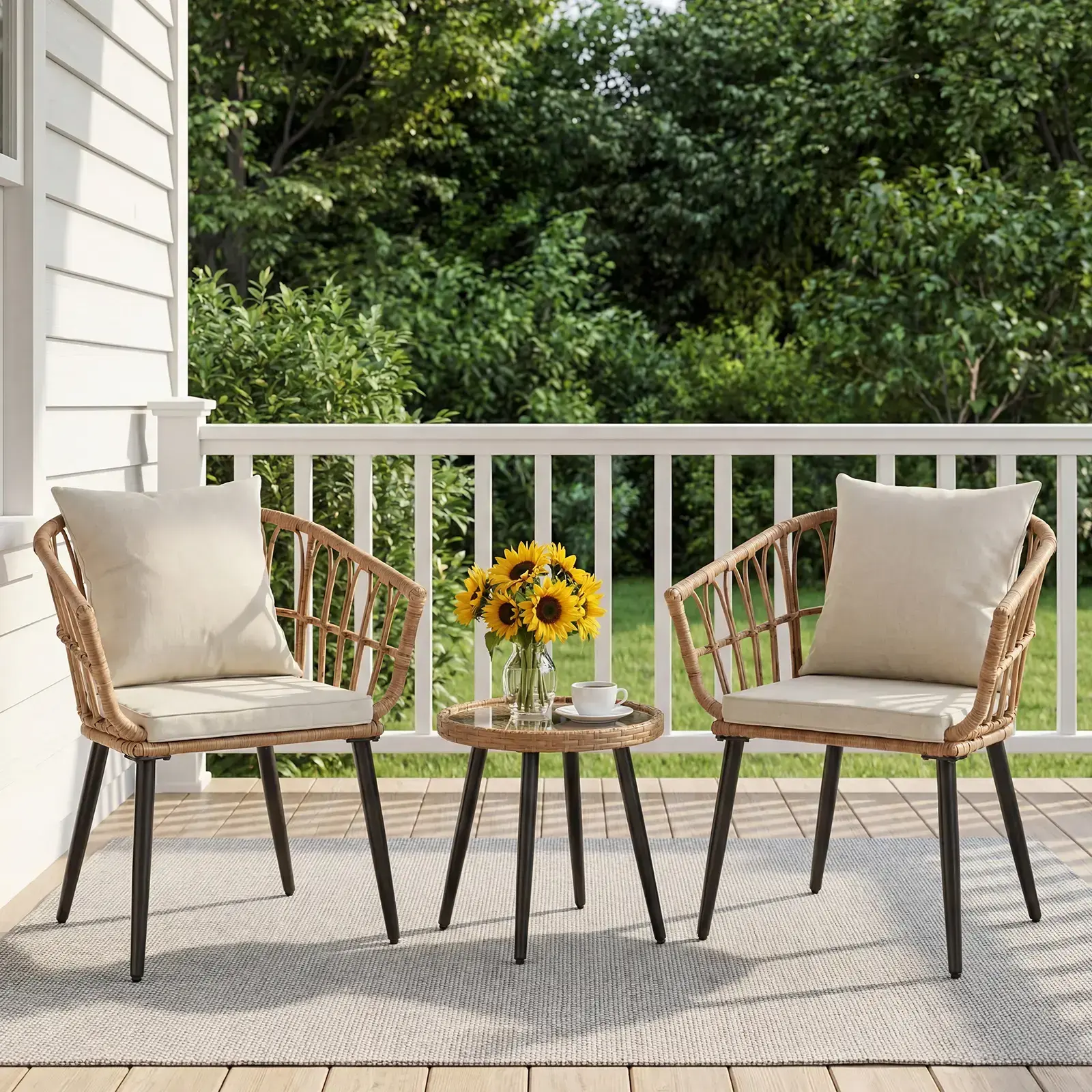 【Mother's Day Gift】Yaheetech 3-Piece Patio Furniture Set, Outdoor Rattan Conversation Furniture Set, 2 Chairs with Cushions & 1 Side Table for Bistro/Porch/Garden/Deck/Courtyard