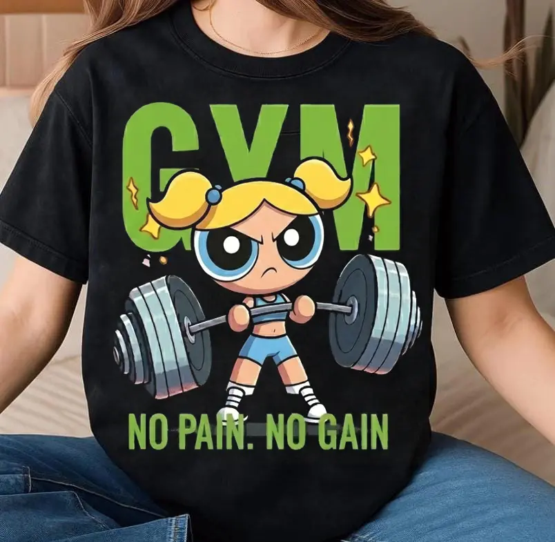 Cute Powerpufff Bubbles No Pain No Gain Graphic T-Shirt, Y2K Bubbles Fitness, Workout Shirt, Trending 2026, Weightlifters, Bodybuilding Shirt, Pump Cover Gym Tee for Men Women