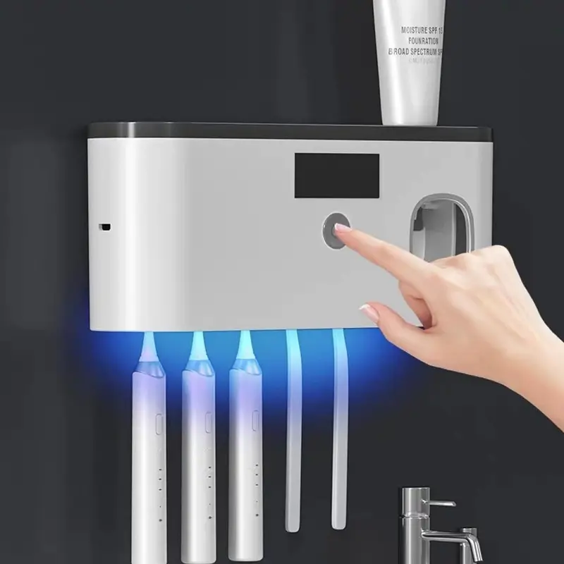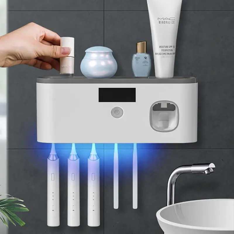 Wall-Mounted Bathroom Toothbrush Holder with UV Sanitizer, Rechargeable Cordless Toothbrush Organizer with Automatic Toothpaste Dispenser, Space-Saving Storage for Toothbrushes and Toothpaste