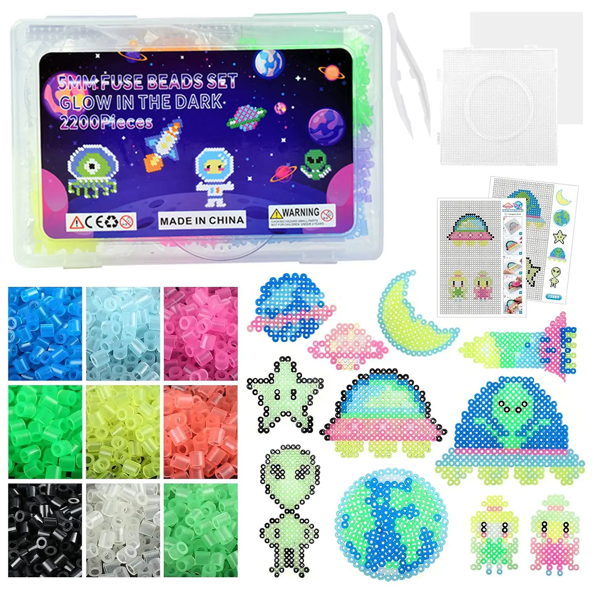 **Glow-in-the-Dark Innovation—Creativity Unleashed:** Featuring a selection of high-quality 5mm glow-in-the-dark fuse beads, these beads absorb light and continue to glow in the dark. Easily create space-themed aliens and luminous decorations, sparking children's curiosity and creative drive.