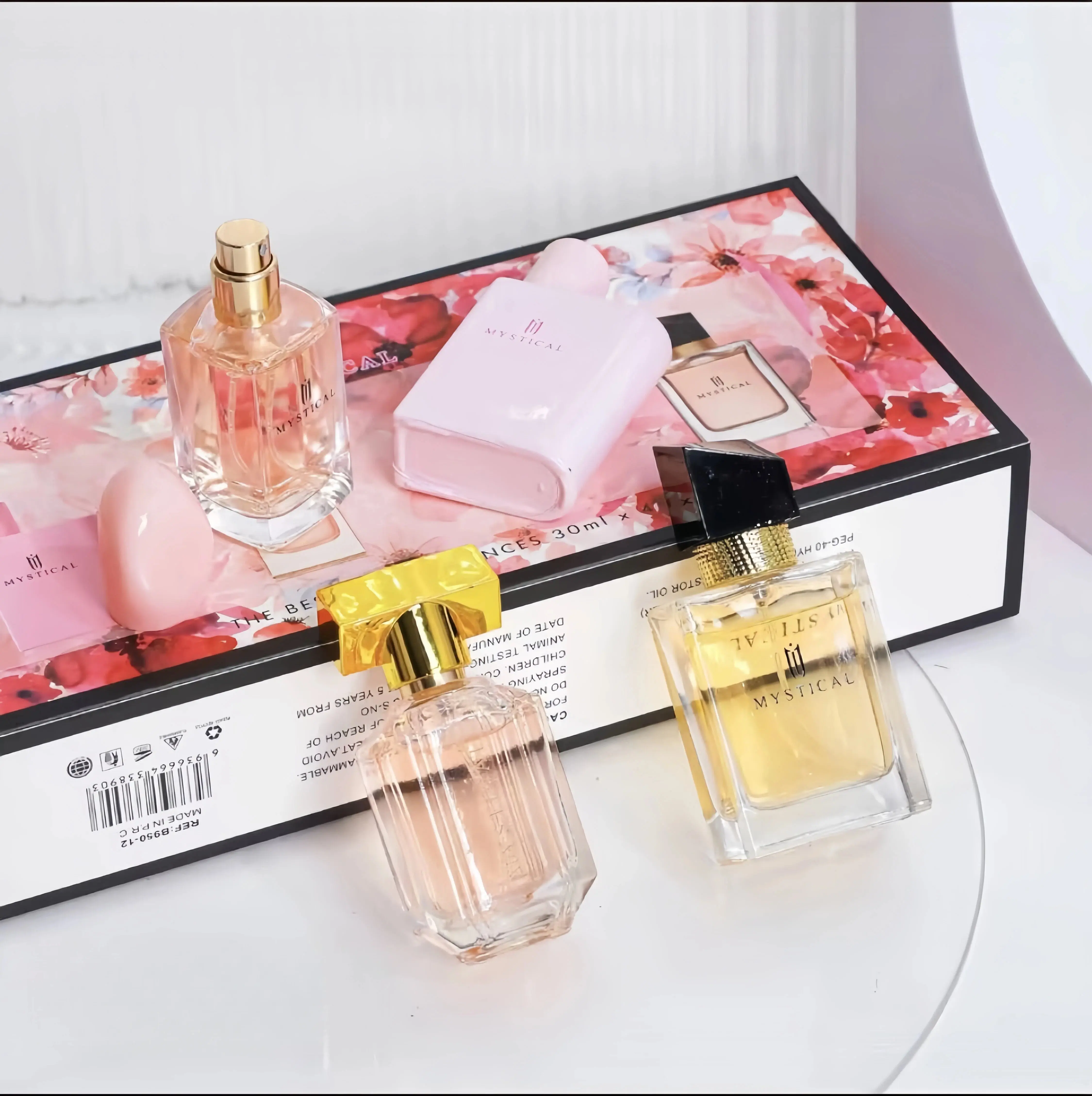 This curated 4-piece collection is designed for the modern woman who loves to switch up her vibe. Each 30ml bottle is crafted with premium, long-lasting fragrance oils, housed in uniquely designed, Instagram-worthy bottles. The set comes in a luxurious floral-print gift box, perfect for gifting or treating yourself.