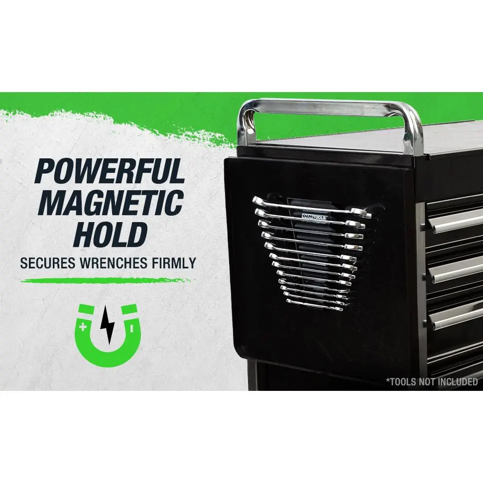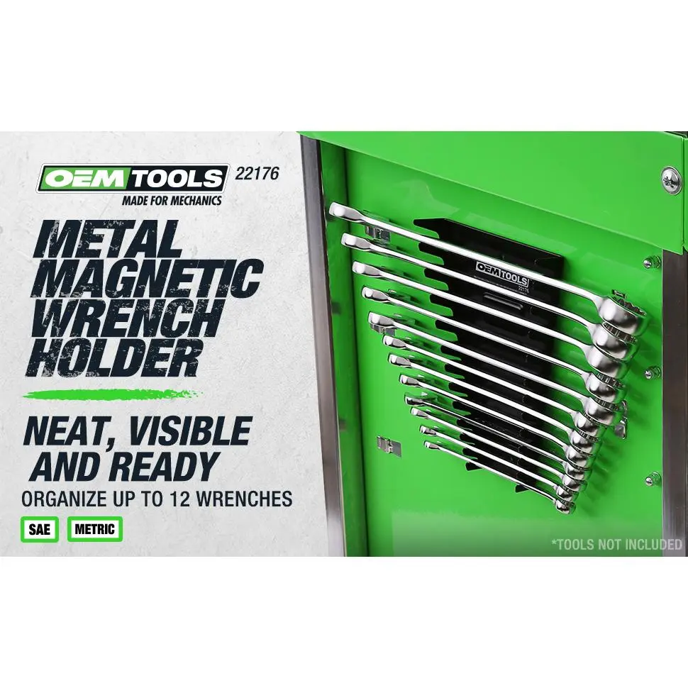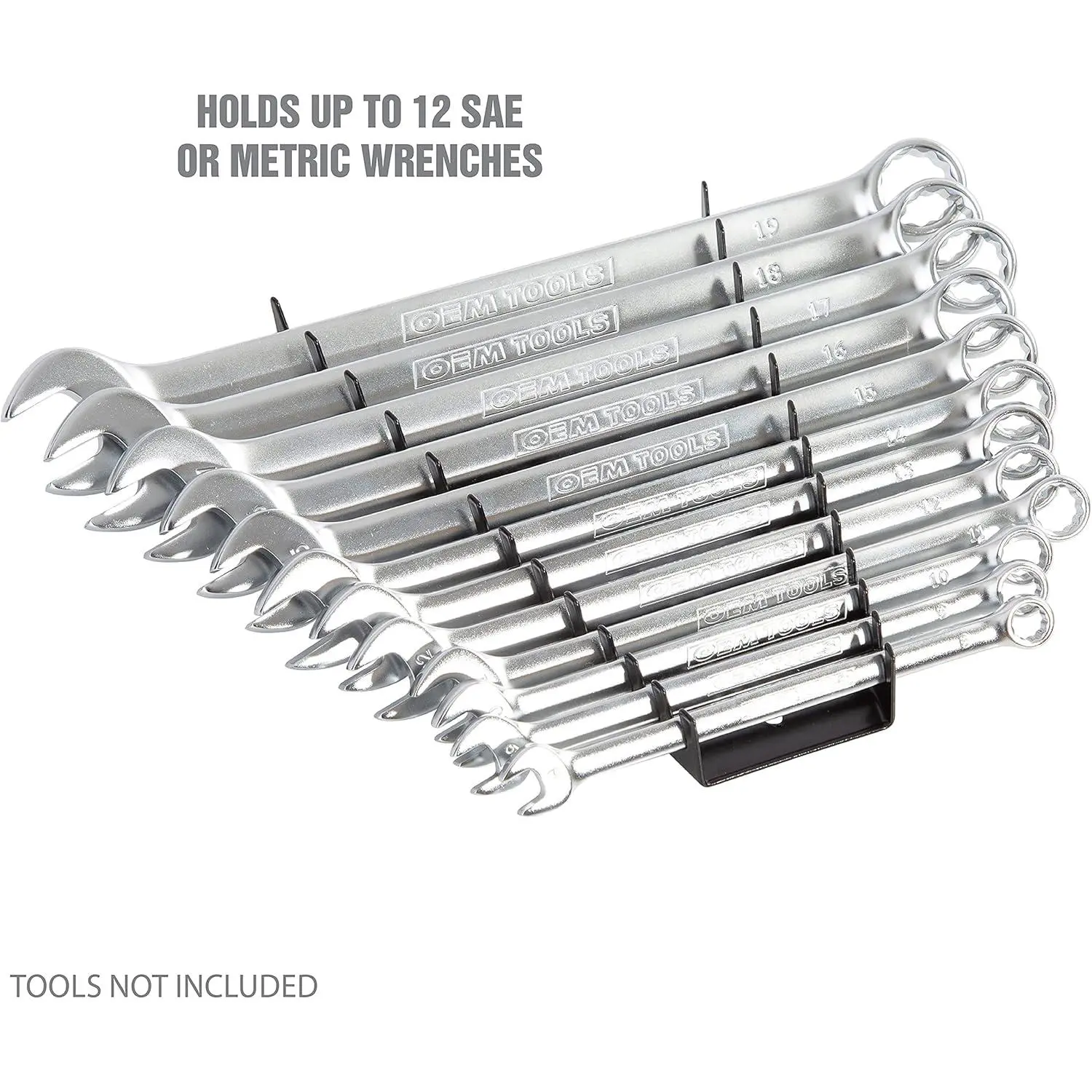 The OEMTOOLS 22176 Pro Magnetic Wrench Holder helps you get the job done faster by eliminating wasted time spent looking for the right tool. The tool box drawer organizer stores up to 12 wrenches in a low profile wrench organizer rail design that will fit in most boxes, drawers, and chests. These toolbox organizers and storage trays fit both SAE and metric wrenches and will keep them at your fingertips as you work. The tool tray base is outfitted with powerful magnets that easily attach to any metal surface where you might need a wrench rack. Plus, a non marring foam backing protects painted surfaces from the scratches and damage you might see with other metal tool trays. This sleek black wrench organizer makes it easy to stay organized and keep the tools you need within arm's reach while you work. Optimize your time in the shop with OEMTOOLS Magnetic Wrench Organizers.