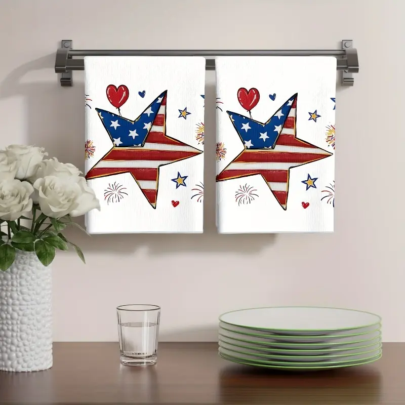 2pcs 23.6x15.7 In Patriotic Independence Day Kitchen Towels Red White Blue Star And Heart Pattern Dish Cloths Rustic Summer Decor Home Decoration Holiday Design Festive Decor