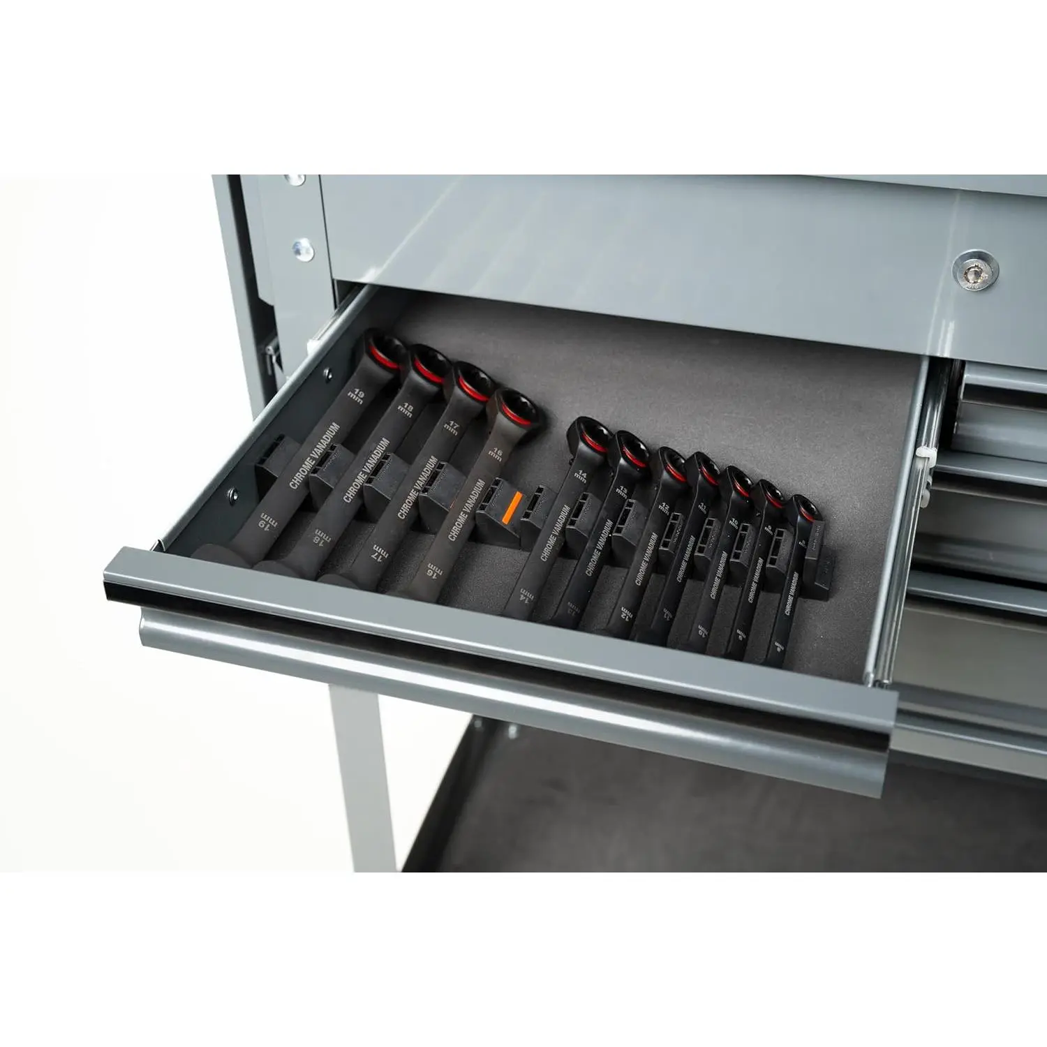 Affordable, Basic Tool Organization – The Basics Wrench Organizer delivers unbeatable value as the most accessible option for pros and DIYers who demand performance and durability.Holds 16 Wrenches in Angled Layout – Patented tray design stores 4 XL, 4 L, 4 M, and 4 S wrenches at a 45° angle for better visibility and more efficient drawer use.Made From Durable Rubber, Not Plastic – Flexible yet tough rubber grips tools securely without cracking or sliding like cheaper plastic trays.Modular With Missing Tool Indicator – Includes 2 end stops for expansion and a bright orange stripe that shows instantly when a wrench is missing.Veteran-Designed and Backed For Life – Created by a combat vet and aircraft mechanic, this wrench holder includes a lifetime warranty for long-term reliability.