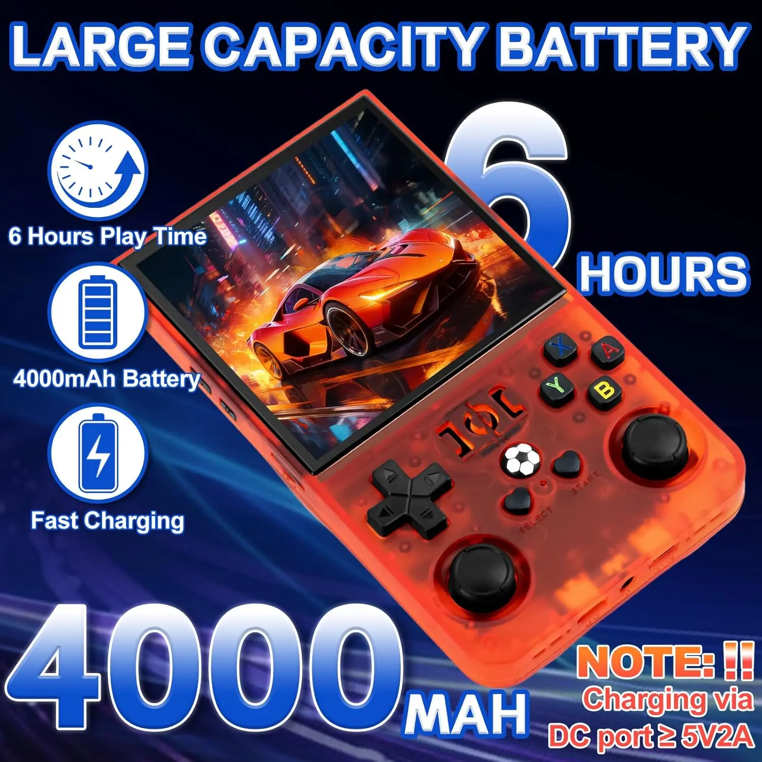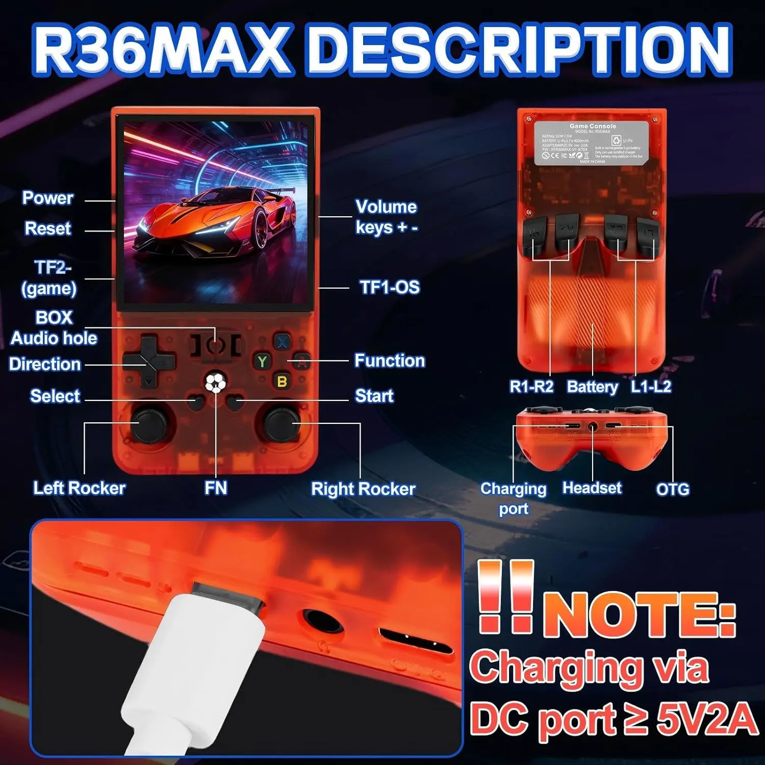 ·Note: 1. For your handheld game console to charge efficiently, we recommend using a charger with an output of at least 5V/2A (10W) or higher. Please ensure that you charge the device through the DC port 2. When you receive your console, the TF card will be inserted inside the game console