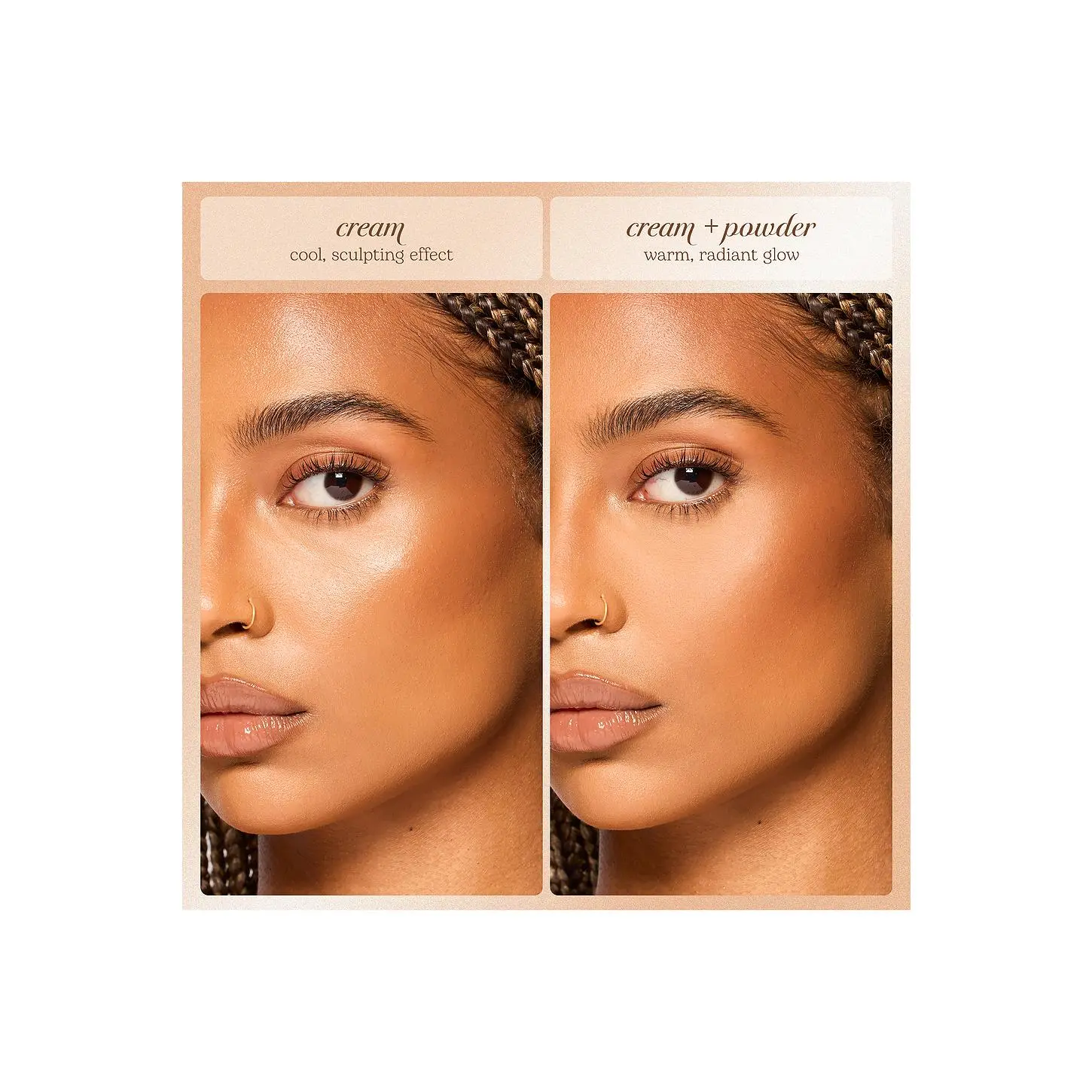 ·A 2-in-1 cream + baked powder bronzer for soft sculpting & sun-kissed warmth in seconds.